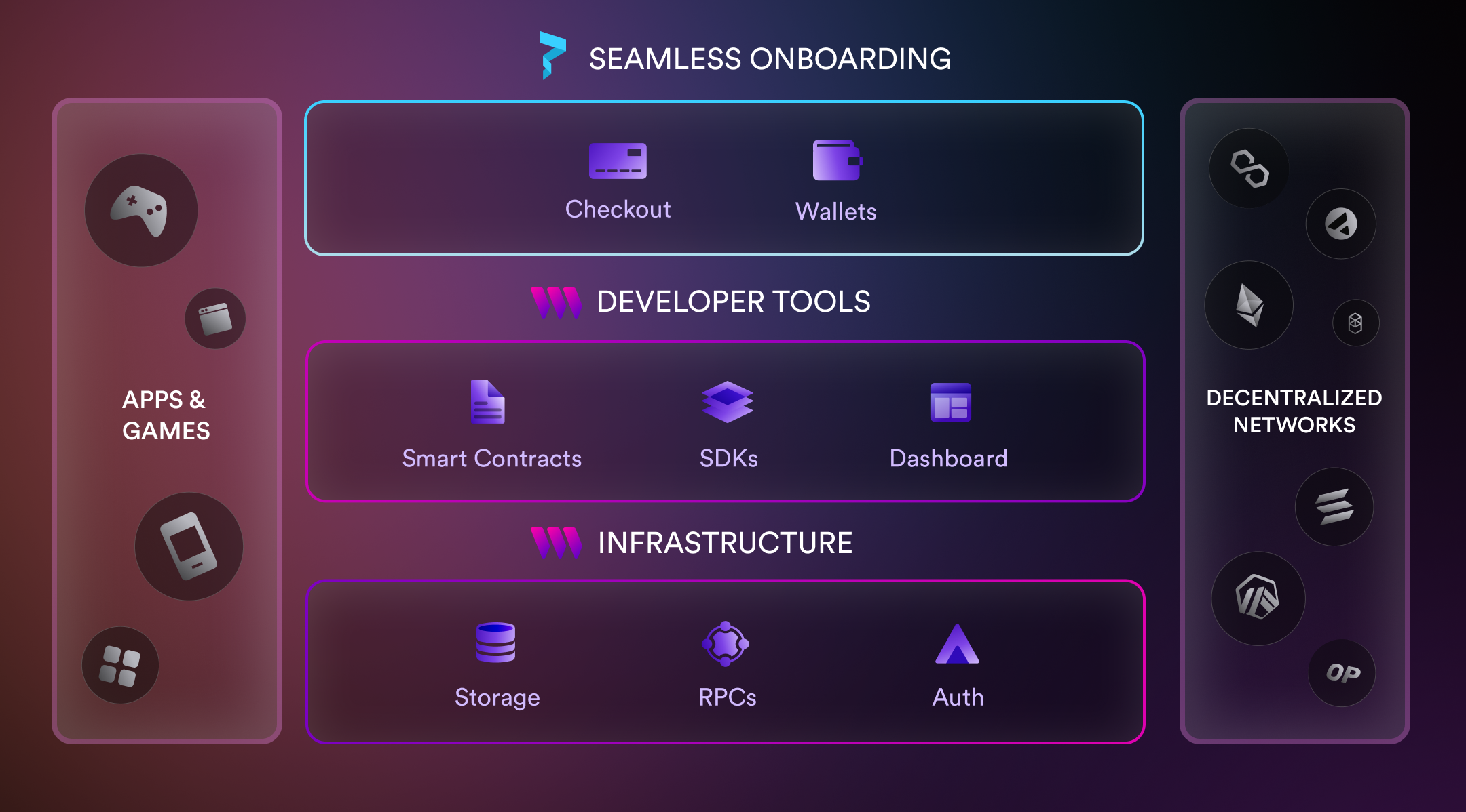 To build a web3 app, companies must often work with 7-8 different providers to piece together all of the blockchain infrastructure they need. But stringing different tools together, going through the compliance & security process with each provider, and working with lots of account managers… it’s hugely problematic.