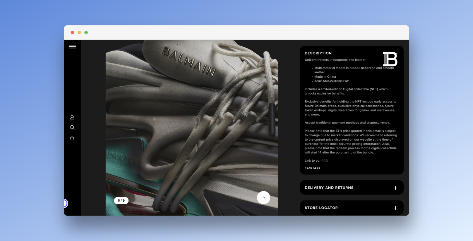 - NFT Integration: Each limited-edition Unicorn sneaker was linked to a unique Balmain x Space Runners Unicorn NFT, which was available for purchase through Balmain's website.