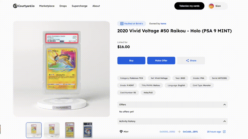 Courtyard does this by insuring & securing physical collectibles in vaults operated by Brink’s, creating rich 3D models of the assets, and minting them as NFTs on the blockchain. The NFTs can then be bought with credit card or crypto, traded between users worldwide in seconds, and exchanged for the physical asset whenever they want.