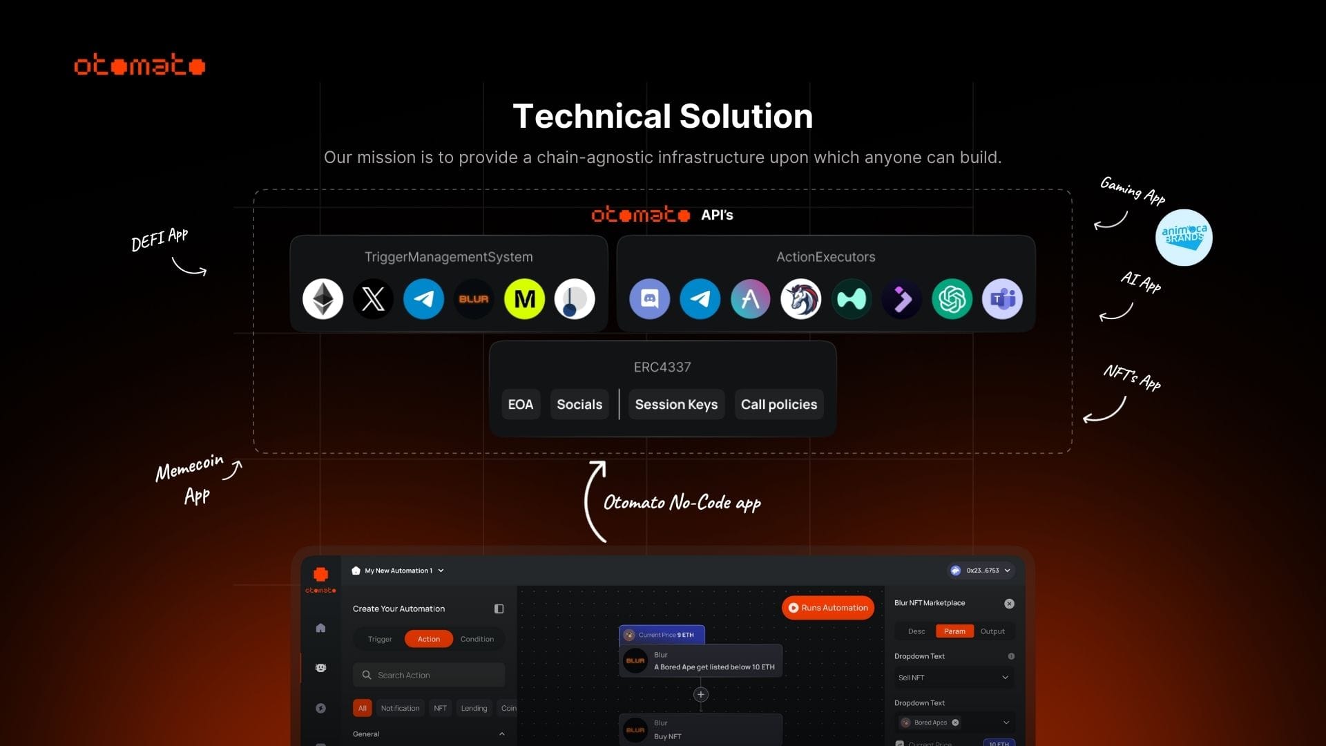Otomato implemented a trigger management system for monitoring blockchain states and an action executor leveraging ERC4337 smart contracts. This architecture allows for trustless, secure, and transparent automations while supporting cross-chain interoperability.