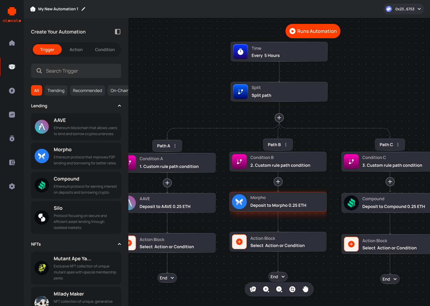 Otomato is a groundbreaking Web3 automation architecture that enables seamless blockchain automation through an innovative trigger-action framework. By leveraging thirdweb's powerful tools and infrastructure, Otomato has created a no-code, drag-and-drop interface for creating custom workflows while maintaining robust security with ERC4337 smart contract accounts.