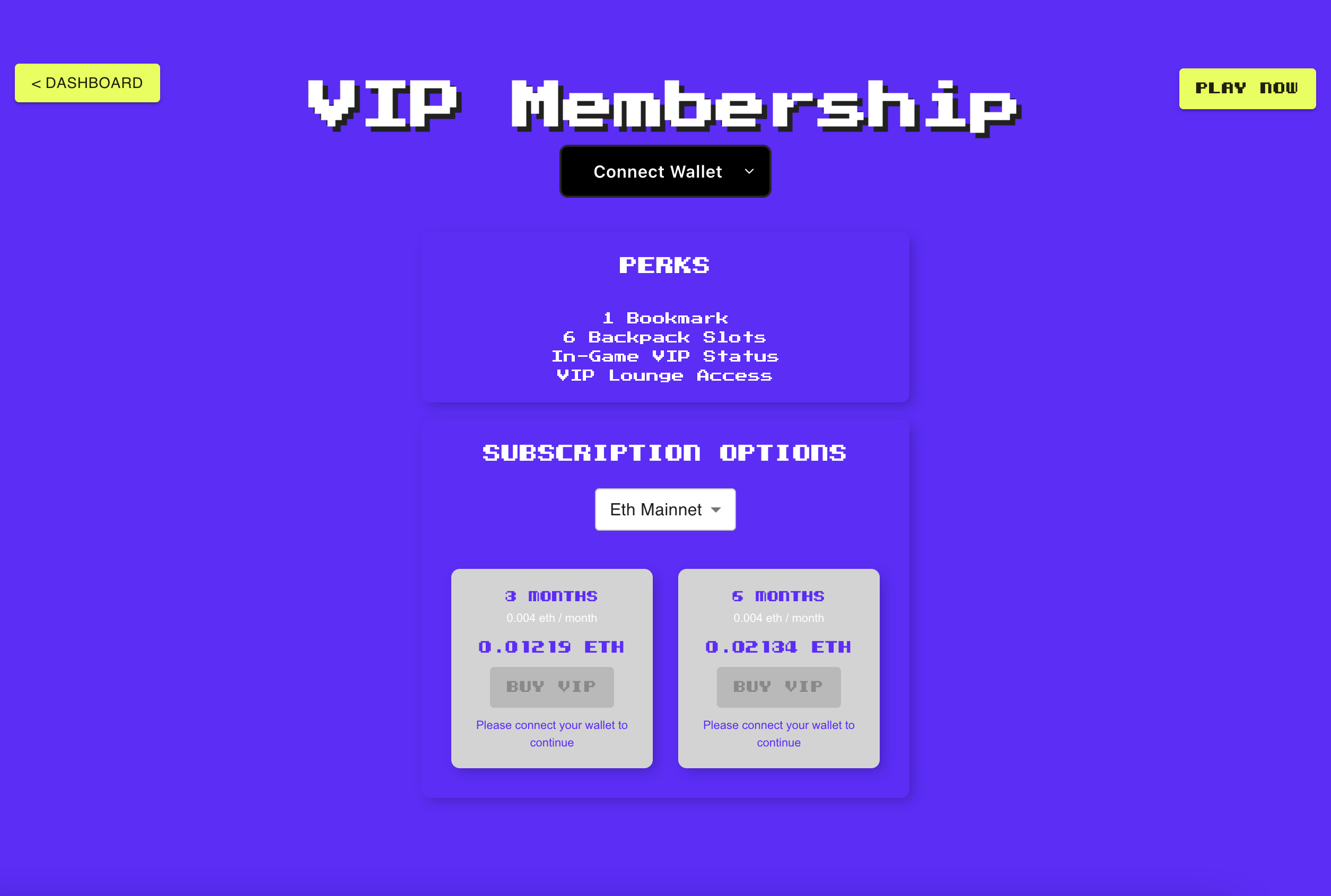 - VIP Memberships: Players can purchase subscriptions (in the form of time-based NFTs) in exchange for in-game perks & additional rewards.