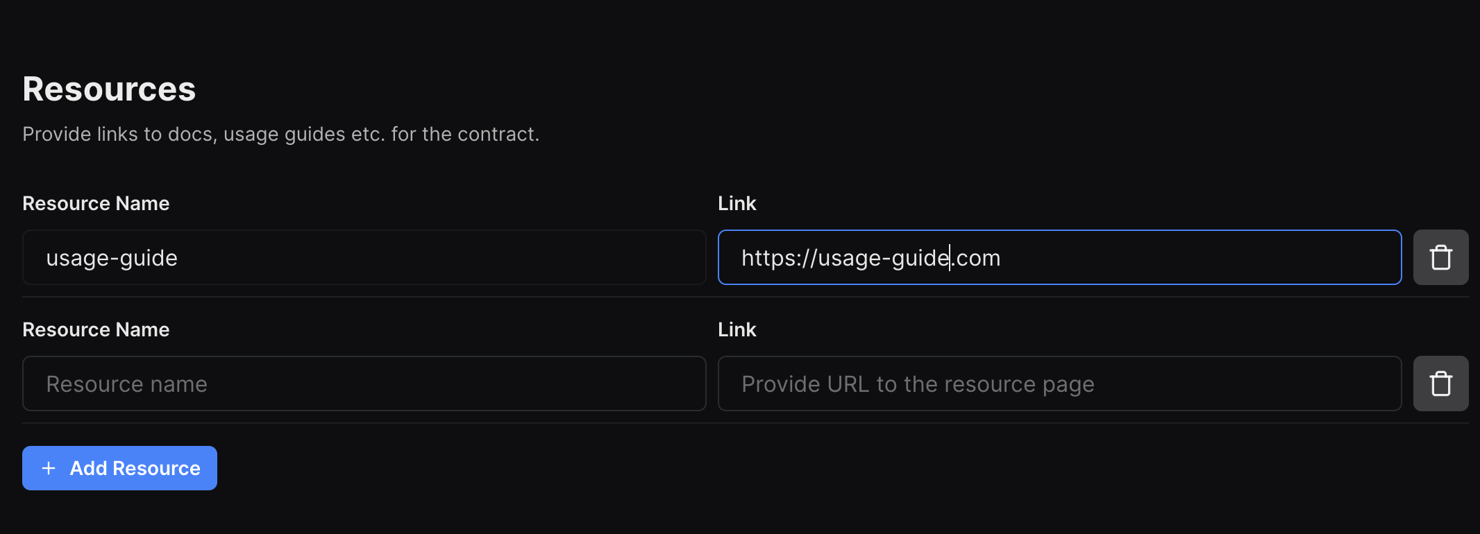 On the publish form, provide resource links in the resources section as shown below, and proceed with publishing the contract after making these changes.