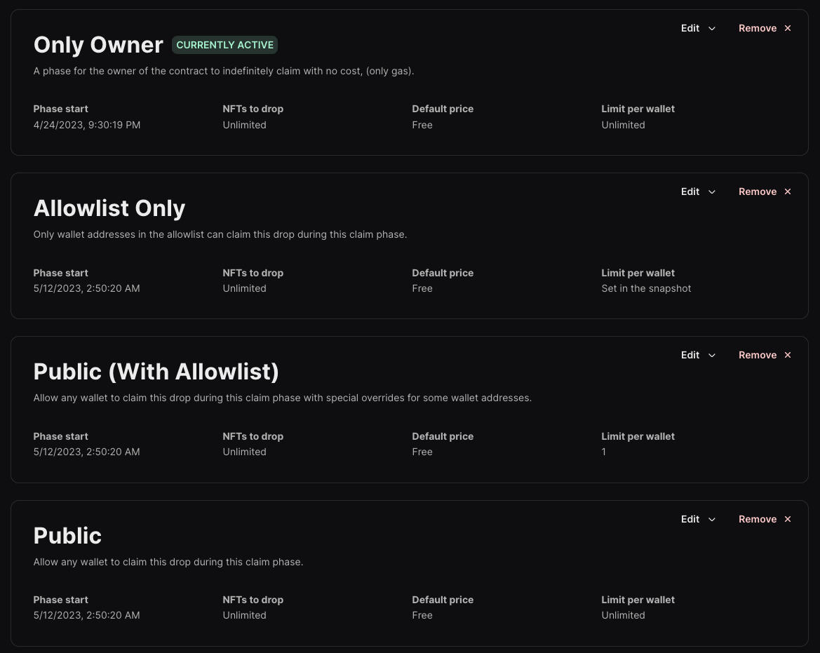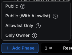 - Only Owner: A phase for the owner of the contract to indefinitely claim with no cost, (only gas). Many times owners want to claim some NFTs before they go live, this makes it so you can set a claim phase like this in one click and not worry about getting your drop sniped when claiming for free.