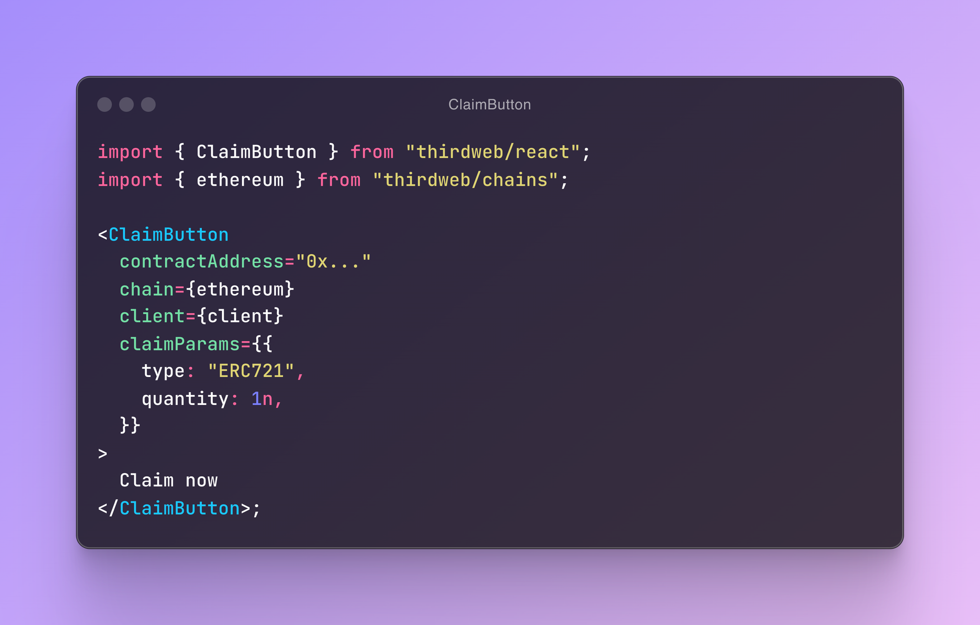 The thirdweb React SDK components are some of the most used across all of web3. We're working to expand our component library to include more capabilities you can already do with the TS SDK. With version 5.39, we've added the ClaimButton component for claiming airdropped ERC20, ERC721, or ERC1155 tokens.
