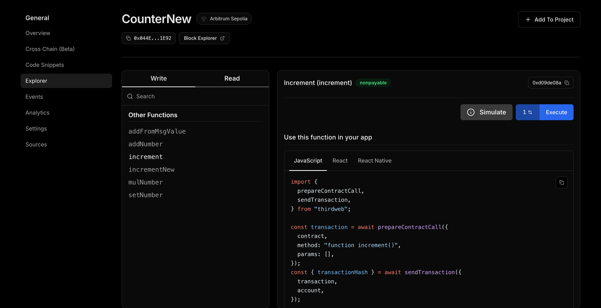 npx thirdweb deploy-stylus -k <YOUR SECRET KEY>After deployment, the contract will be available on thirdweb dashboard. You can interact with it via dashboard or integrate it in your app using the code snippets as shown below: