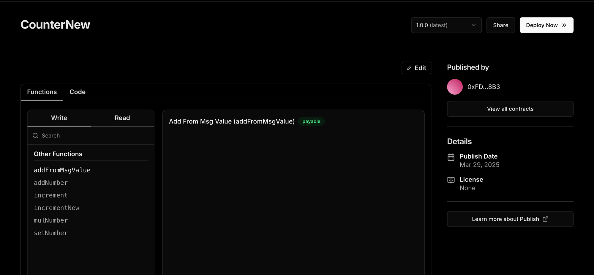 npx thirdweb publish-stylus -k <YOUR SECRET KEY>Publishing a contract saves the contract metadata to an onchain registry, and creates a contract page from where you can deploy a specific version of this contract multiple times.