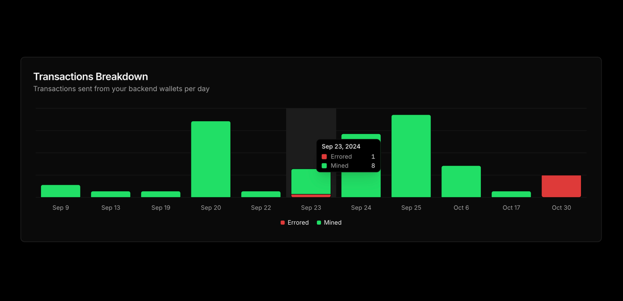 This chart shows a breakdown of transactions sent by your Engine's backend wallets by their status. This gives you an insight into the transaction volume and success/error rate trend at a glance