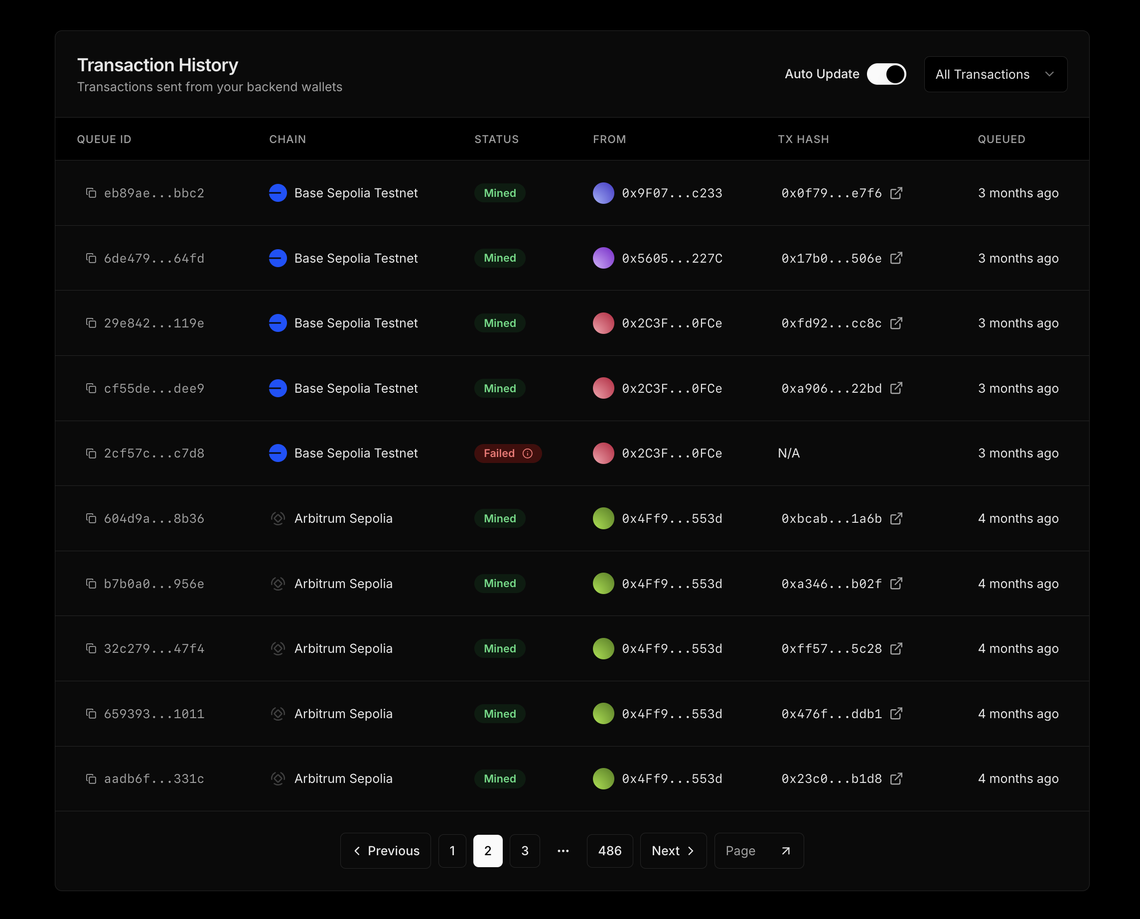 Pagination and Status filters added in Transaction history table. Pagination UI also has an input field that allows you quickly jump to a page - allowing you to quickly comb through a large list of transactions