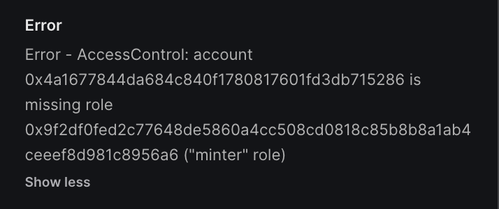 cannot estimate gas; transaction may fail or may require manual gas limit [ See: https://links.ethers.org/v5-errors-UNPREDICTABLE_GAS_LIMIT ] (error={"reason":"execution reverted","code":"UNPREDICTABLE_GAS_LIMIT","method":"estimateGas","transaction":{"from":"0x4a1677844Da684c840f1780817601fd3DB715286","maxPriorityFeePerGas":{"type":"BigNumber","hex":"0x10c8e0"},"maxFeePerGas":{"type":"BigNumber","hex":"0x10cadc"},"to":"0x9ca57B9341dCB029a5b11163C9a47FB65BA6F4c3","value":{"type":"BigNumber","hex":"0x00"},"data":"0x0075a3170000000000000000000000004a1677844da684c840f1780817601fd3db71528600000000000000000000000000000000000000000000000000000000000000400000000000000000000000000000000000000000000000000000000000000037697066733a2f2f516d5078364d594d5a7a54466b4e703336787a394832374e58433753334d454a6947476b59636a4d6b766a5a35712f30000000000000000000","type":2,"accessList":null},"error":{"code":3,"data":"0x08c379a000000000000000000000000000000000000000000000000000000000000000200000000000000000000000000000000000000000000000000000000000000094416363657373436f6e74726f6c3a206163636f756e7420307834613136373738343464613638346338343066313738303831373630316664336462373135323836206973206d697373696e6720726f6c6520307839663264663066656432633737363438646535383630613463633530386364303831386338356238623861316162346365656566386439383163383935366136000000000000000000000000"}}, tx={"to":{},"from":"0x4a1677844da684c840f1780817601fd3db715286","data":"0x0075a3170000000000000000000000004a1677844da684c840f1780817601fd3db71528600000000000000000000000000000000000000000000000000000000000000400000000000000000000000000000000000000000000000000000000000000037697066733a2f2f516d5078364d594d5a7a54466b4e703336787a394832374e58433753334d454a6947476b59636a4d6b766a5a35712f30000000000000000000","value":{"type":"BigNumber","hex":"0x00"},"nonce":{"type":"BigNumber","hex":"0x00"},"maxFeePerGas":{"type":"BigNumber","hex":"0x10cadc"},"maxPriorityFeePerGas":{"type":"BigNumber","hex":"0x10c8e0"},"type":2,"gasLimit":{},"chainId":{}}, code=UNPREDICTABLE_GAS_LIMIT, version=abstract-signer/5.7.0)Now: A clear error returned the contract.