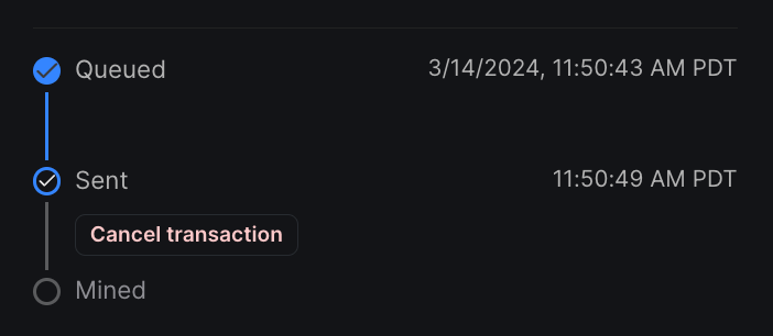 The timeline in the dashboard shows where in the lifecycle the current transaction is. Select Cancel transaction to cancel any transactions not yet mined.