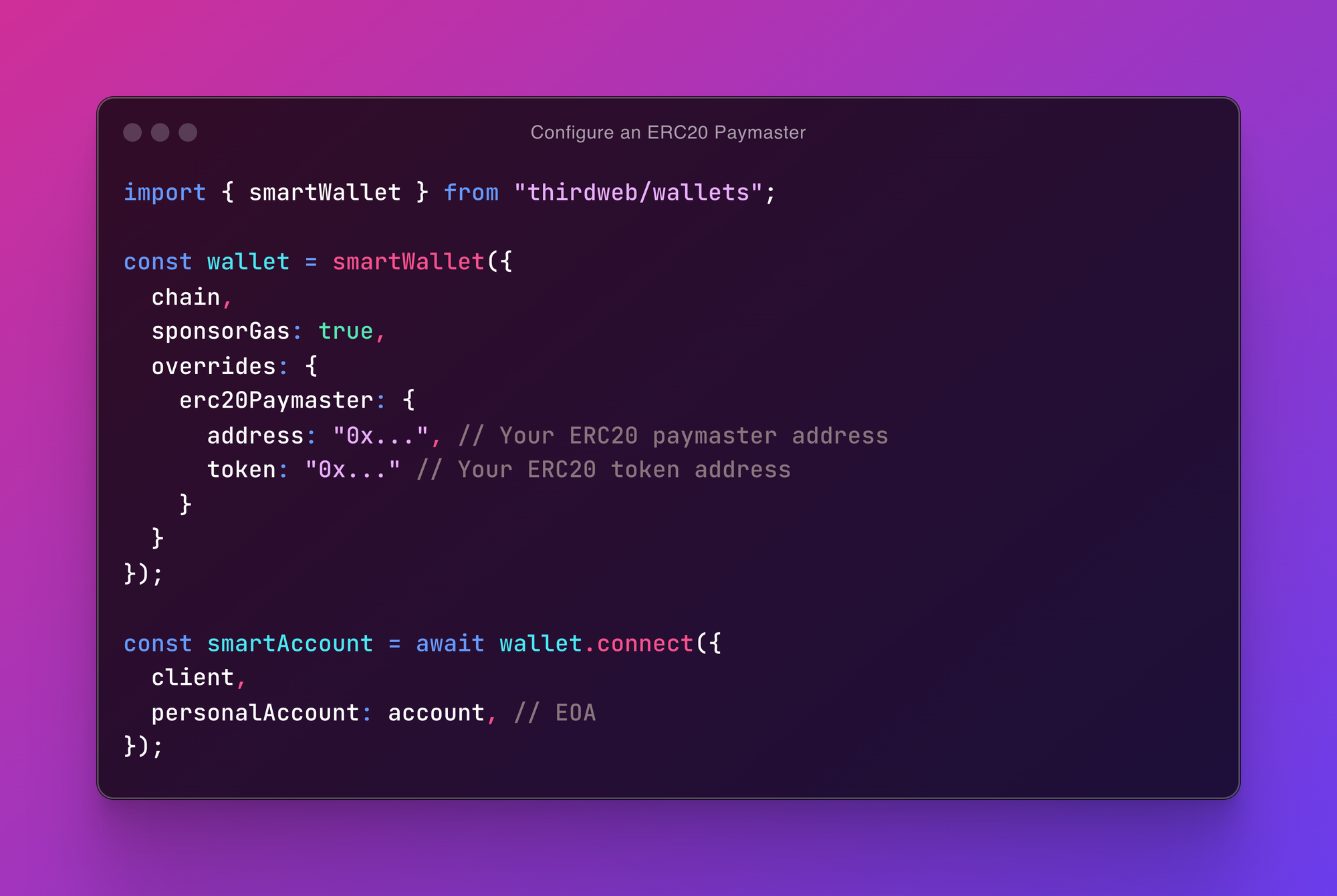 Quick demo of the ERC20 Paymasters support in the @thirdweb connect SDK!