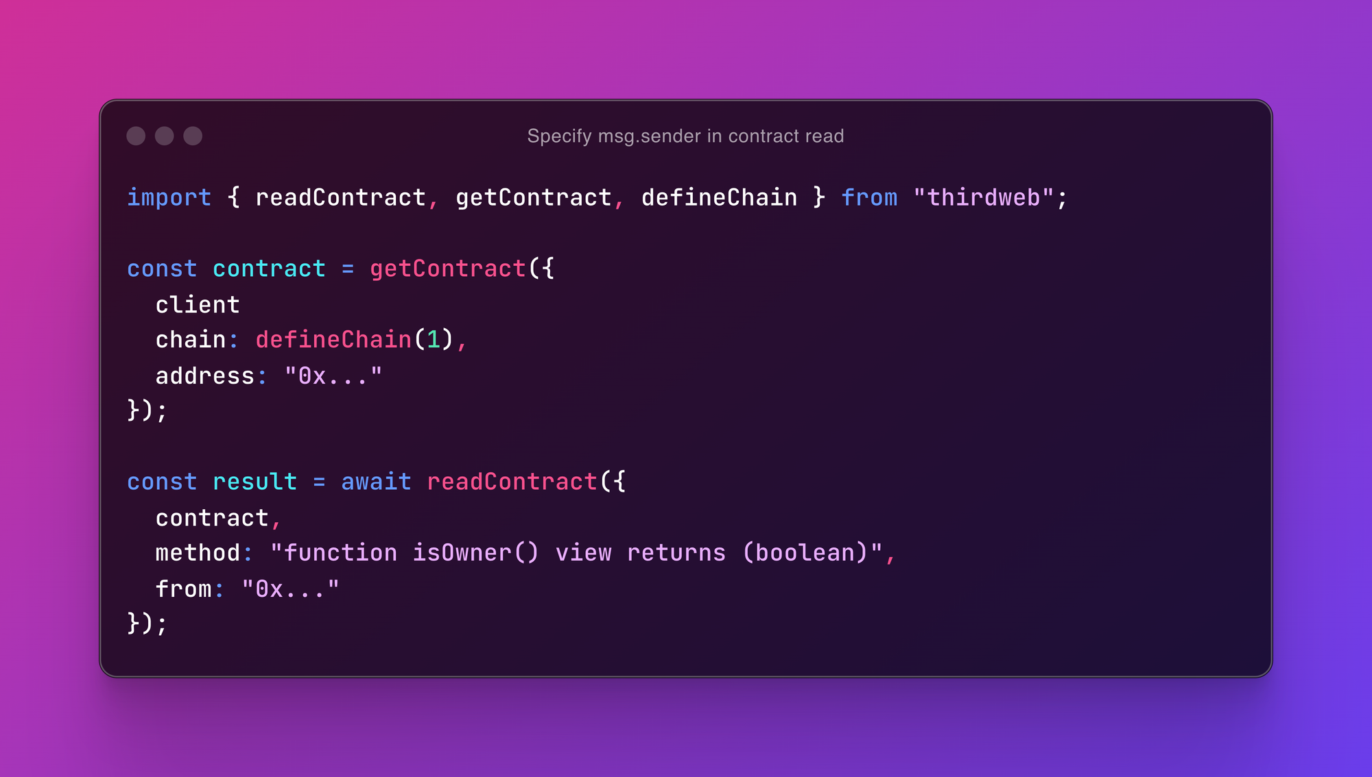 You can now specify a from field when reading contracts with readContract or useReadContract. This is useful for contract methods that may behave differently based on the msg.sender.