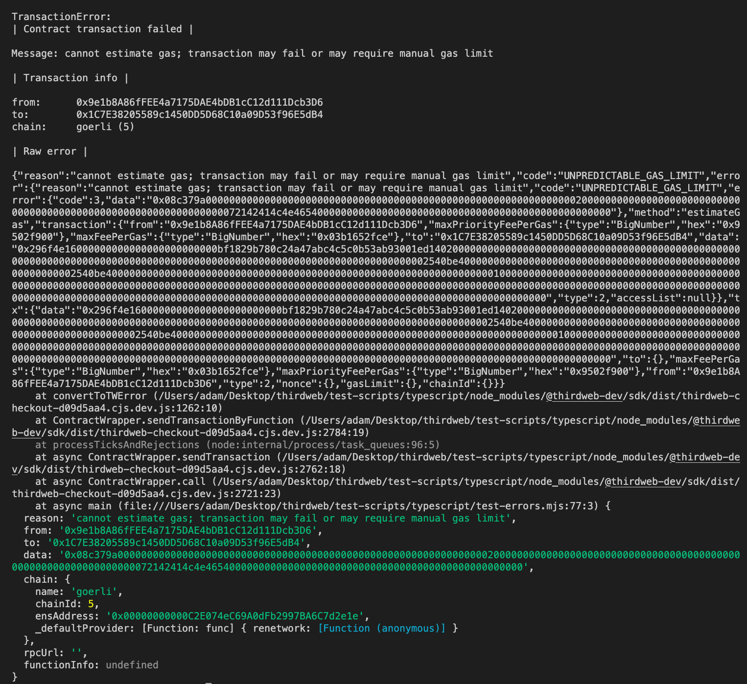 Error messages in the TypeScript SDK on reverts and other transaction errors will now display a message with all relevant transaction data, the revert reason, and a solidity stack trace of where the revert came from in the smart contract code!