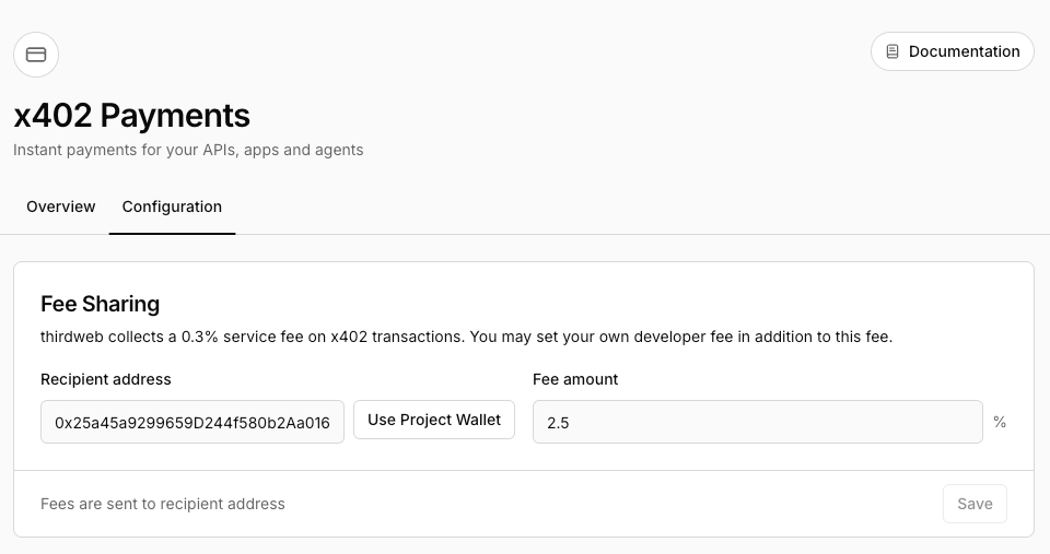 Simply set up your fee amount and recipient address in your project dashboard under the new x402 section to get started.