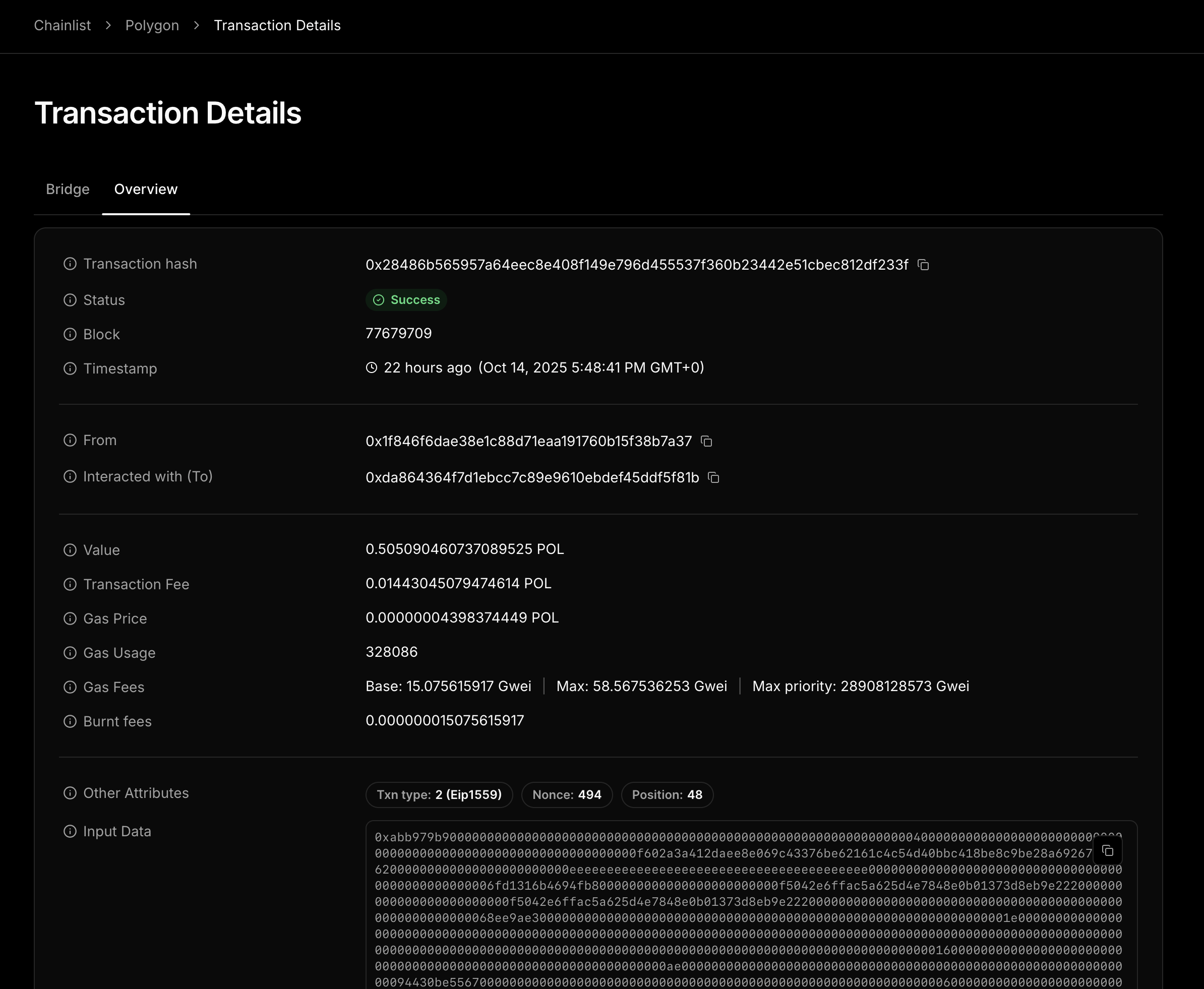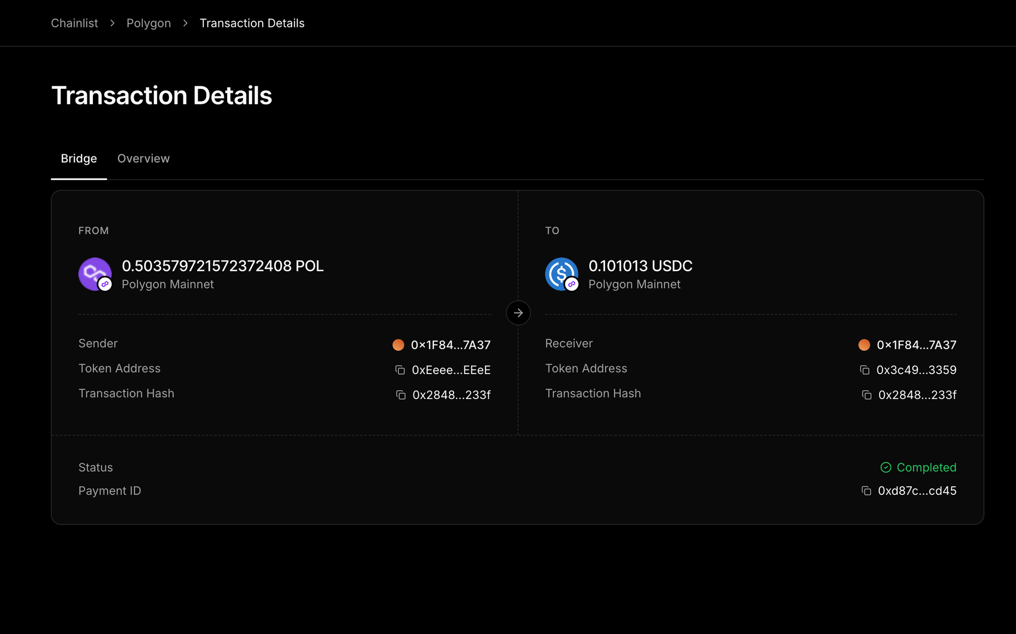 Transactions that are part of a bridge now display a dedicated Bridge section showing cross-chain details, token amounts, and status.