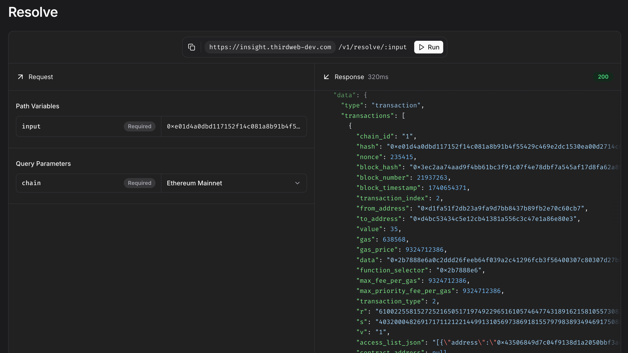const response = await fetch('https://1.insight.thirdweb.com/v1/resolve/0xe01d4a0dbd117152f14c081a8b91b4f55429c469e2dc1530ea00d2714c6bb2a8', {
