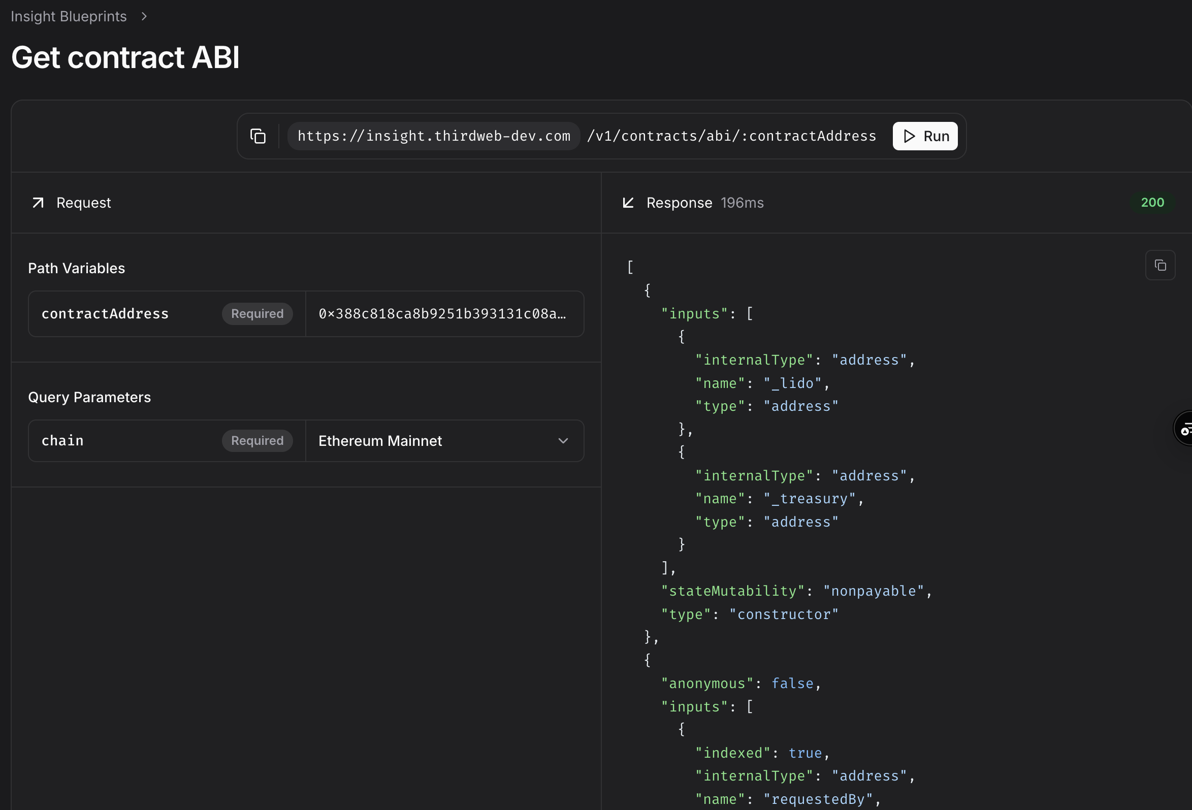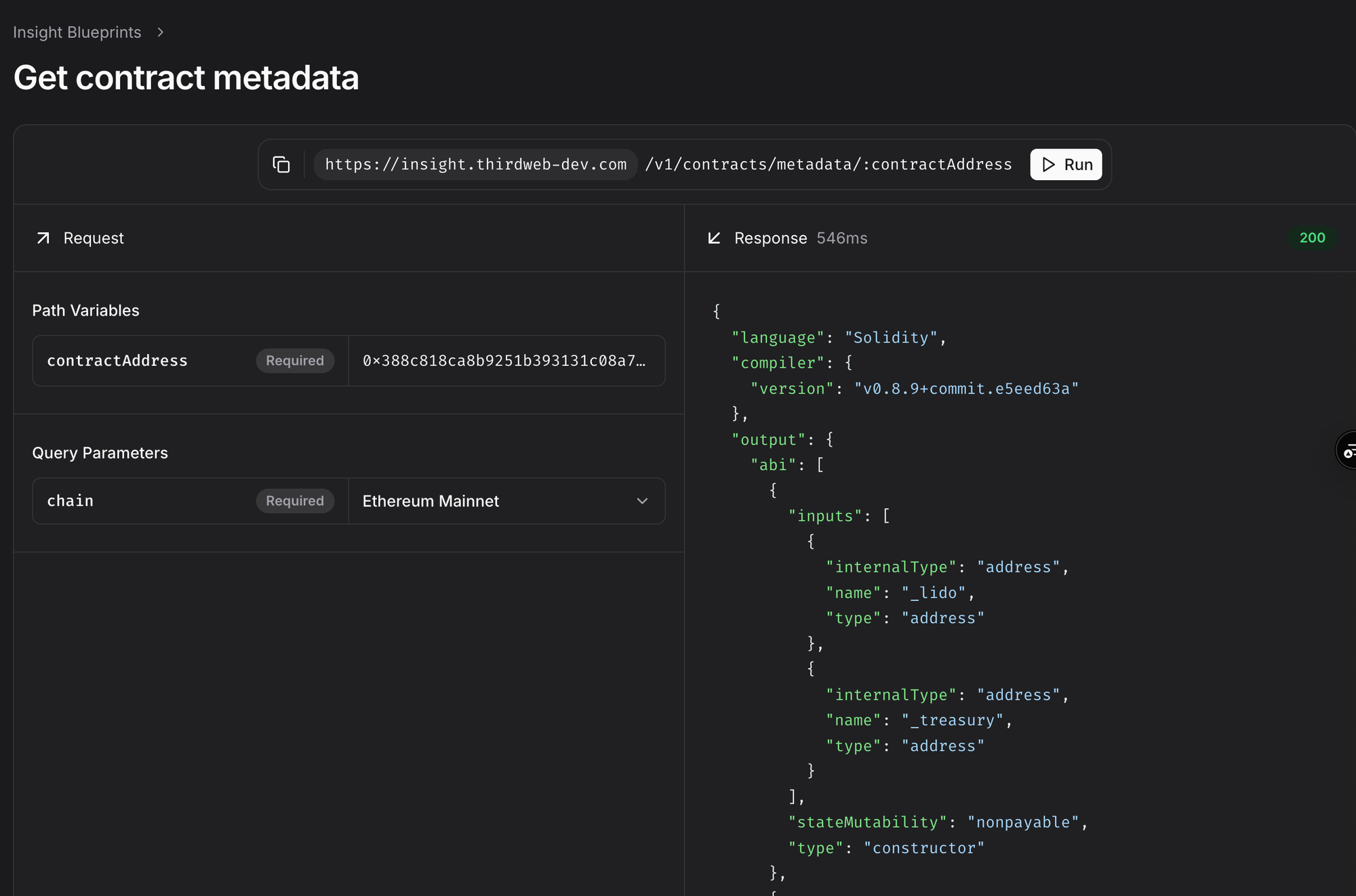 The Insights API now supports querying contract metadata and ABIs. Powered by our contract indexing and verification backend, developers can now access verified contract metadata and ABIs for all supported chains directly within Insights. This eliminates the need to interact with block explorers and third party source code verifiers to get contract metadata and ABIs.