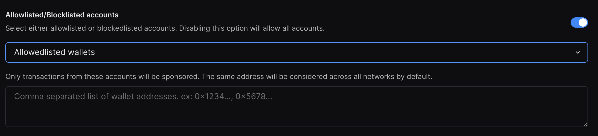 Account lists has 2 modes - blocklist and allowlist. Blocklist lets you stop malicious actors from being able to access sponsored transactions. Allowlist does the opposite - it lets you specify a list of account addresses where only transactions sent by one of those accounts will be sponsored.