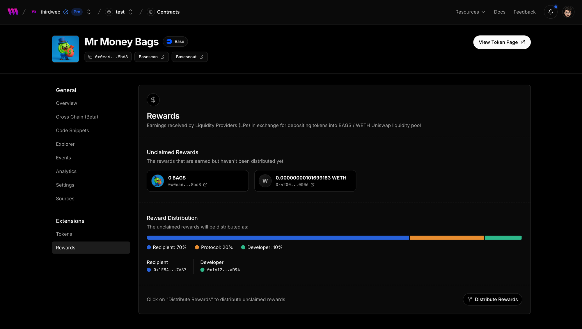 Each trade earns 1% fee - 70% of which is earned by your wallet. You can easily claim the rewards by going to thirdweb Dashboard > Your Team > Your Project > Tokens > Select Token > Rewards and Click “Distribute Rewards” button