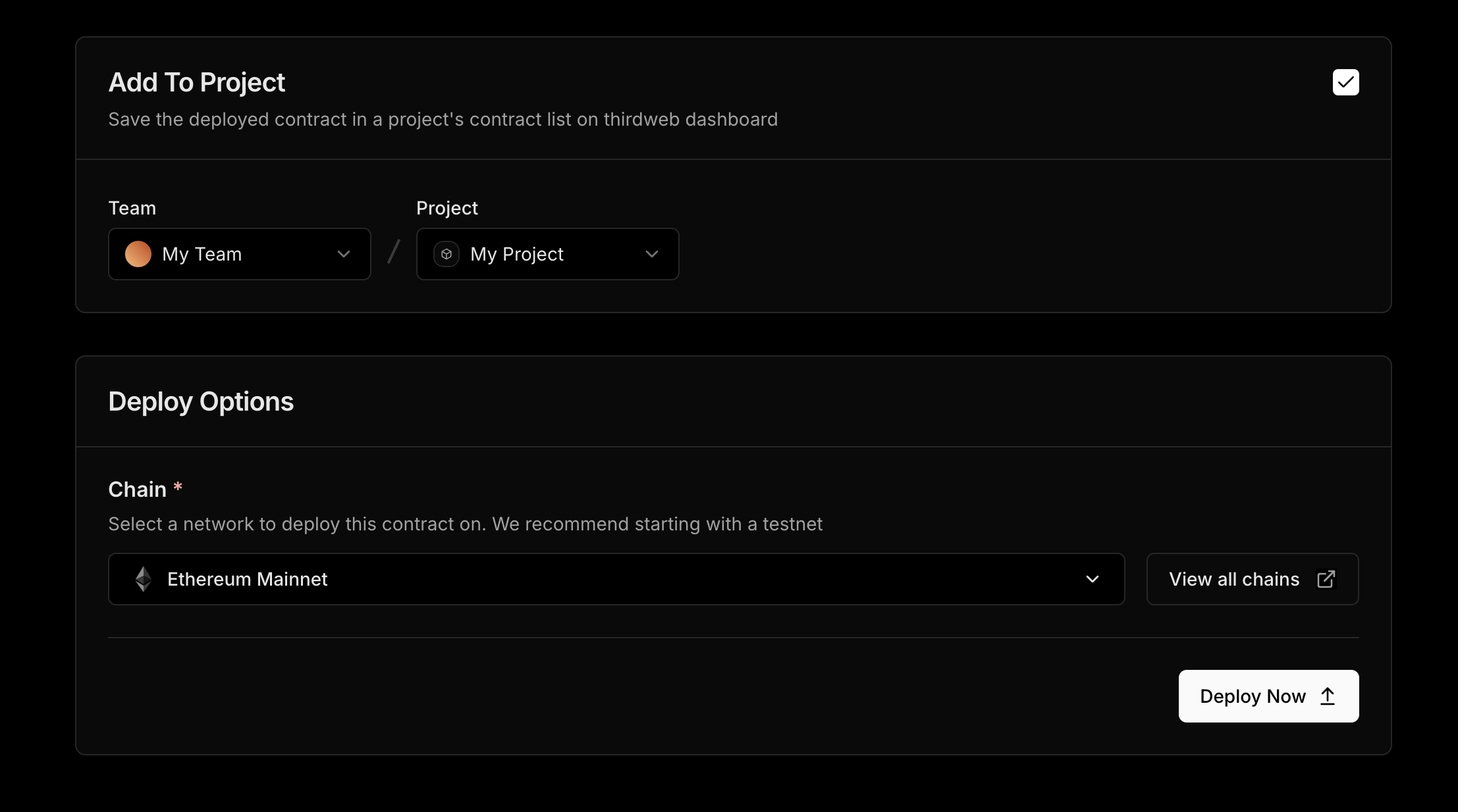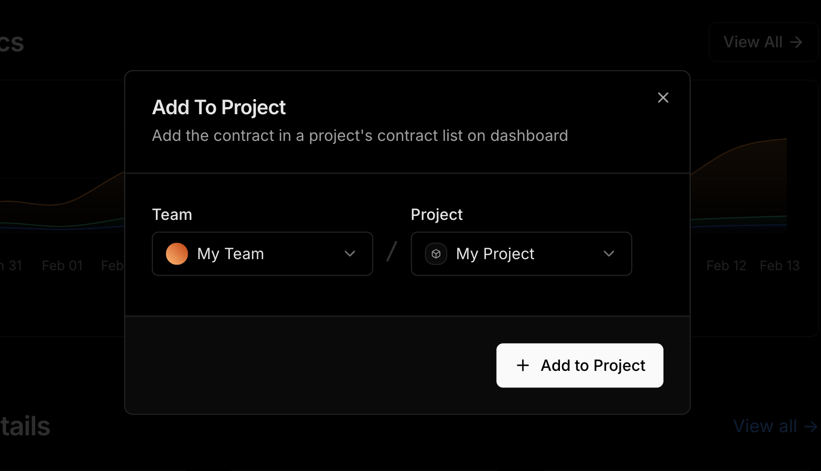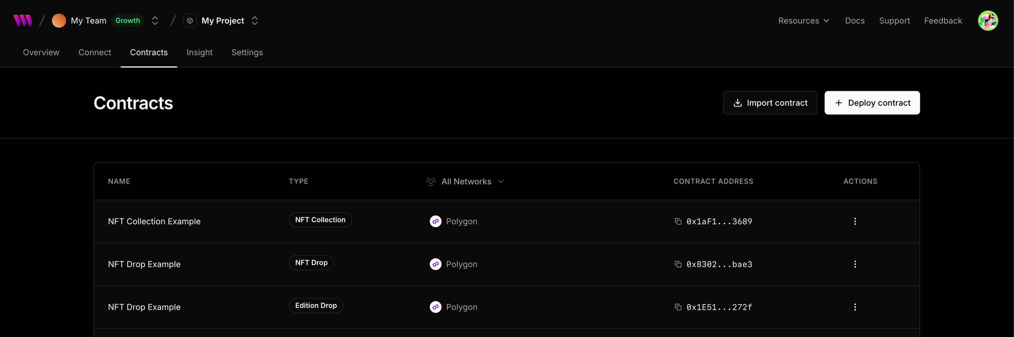 Previously, the thirdweb dashboard only allowed you to import contracts, without the ability to associate them with specific projects. Contracts were displayed as a single list across teams, projects, and account pages.