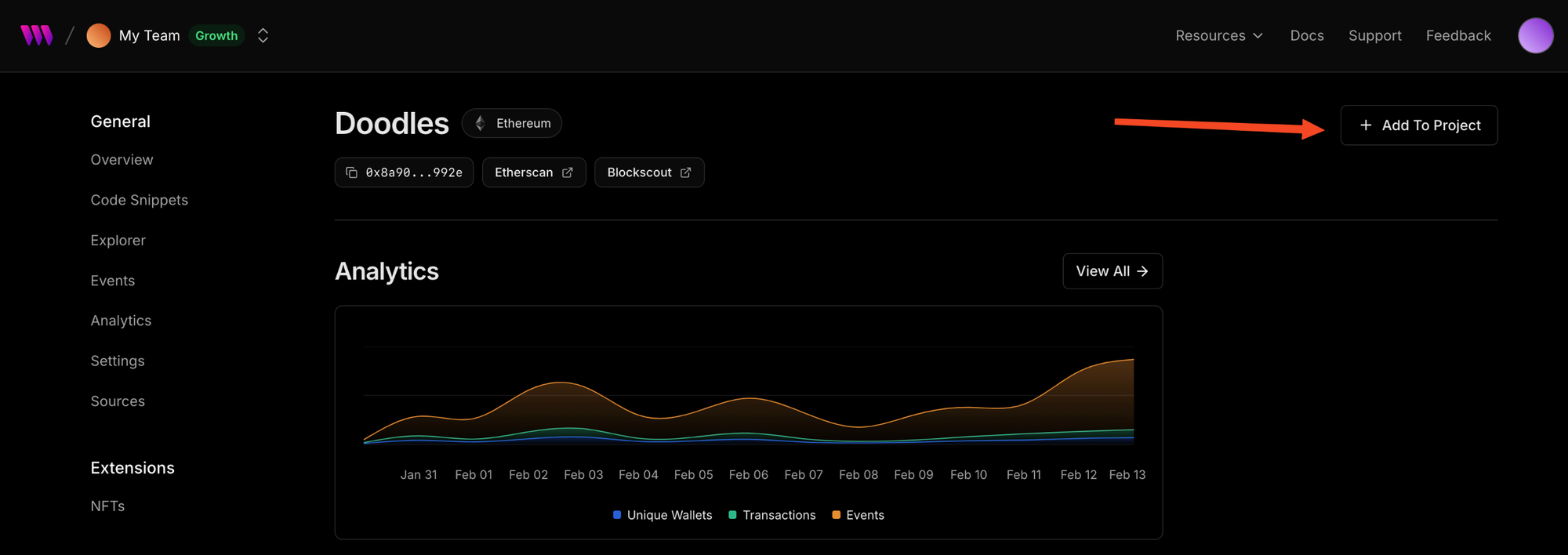 Existing contracts can be added to projects with the new "Add to Project" button on the contract details page. Here's Doodles NFT contract for example: