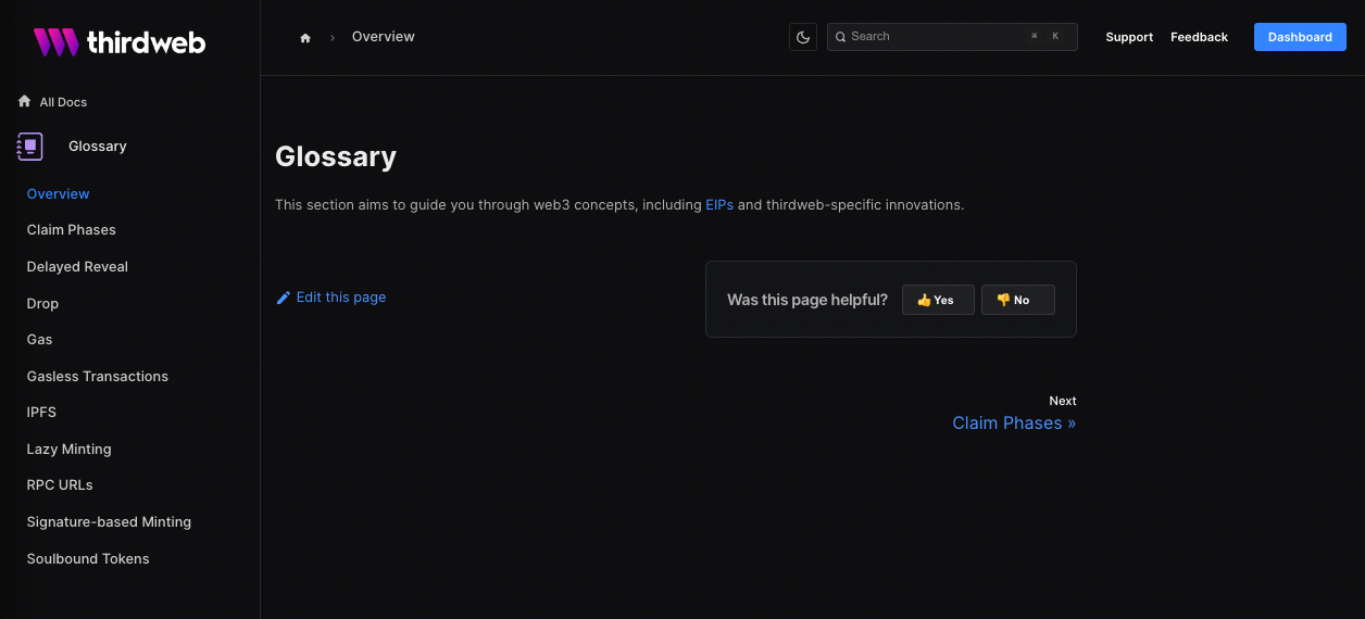 The glossary section is a dedicated area for you to find definitions and explanations of terms related to web3 and thirdweb, including topics such as claim phases, gasless transactions, lazy minting, signature-based minting, and more.