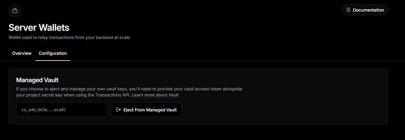 The Vault section has moved here, it is what powers Server Wallets and you can manage it there. By default, no action is needed and it is managed automatically, but you can choose to eject from it and pass extra x-vault-access-token to our APIs and SDKs to interact with your server wallets if you do so.