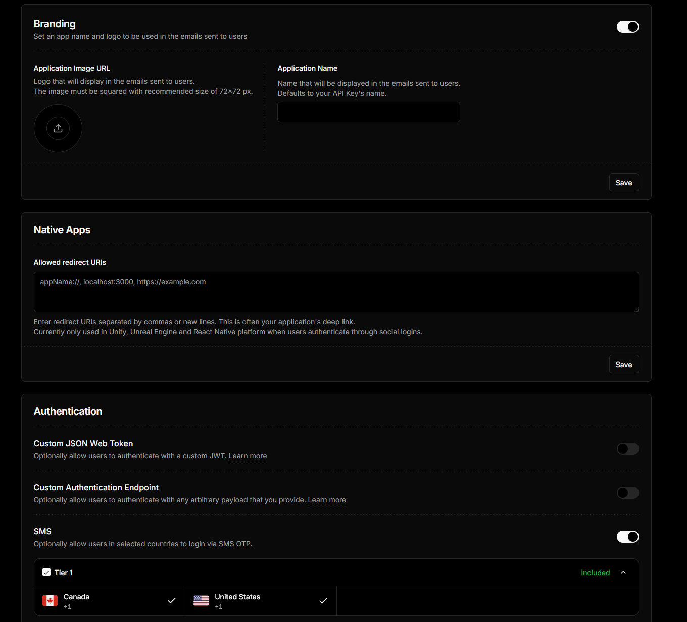 The configuration section contains your User Wallet configurable options such as custom authentication and branding for OTP emails.