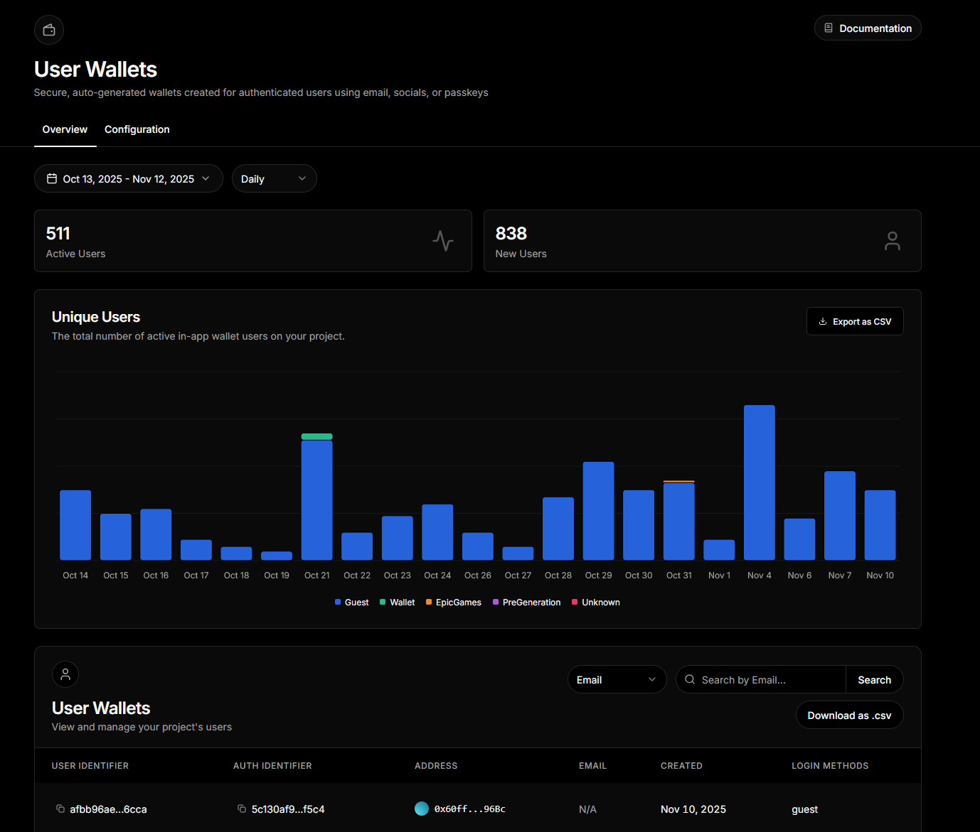 The first section is for your user wallets, previously in-app wallets, attached to authenticated users on your frontend. It contains general analytics as well as a searchable list of users.