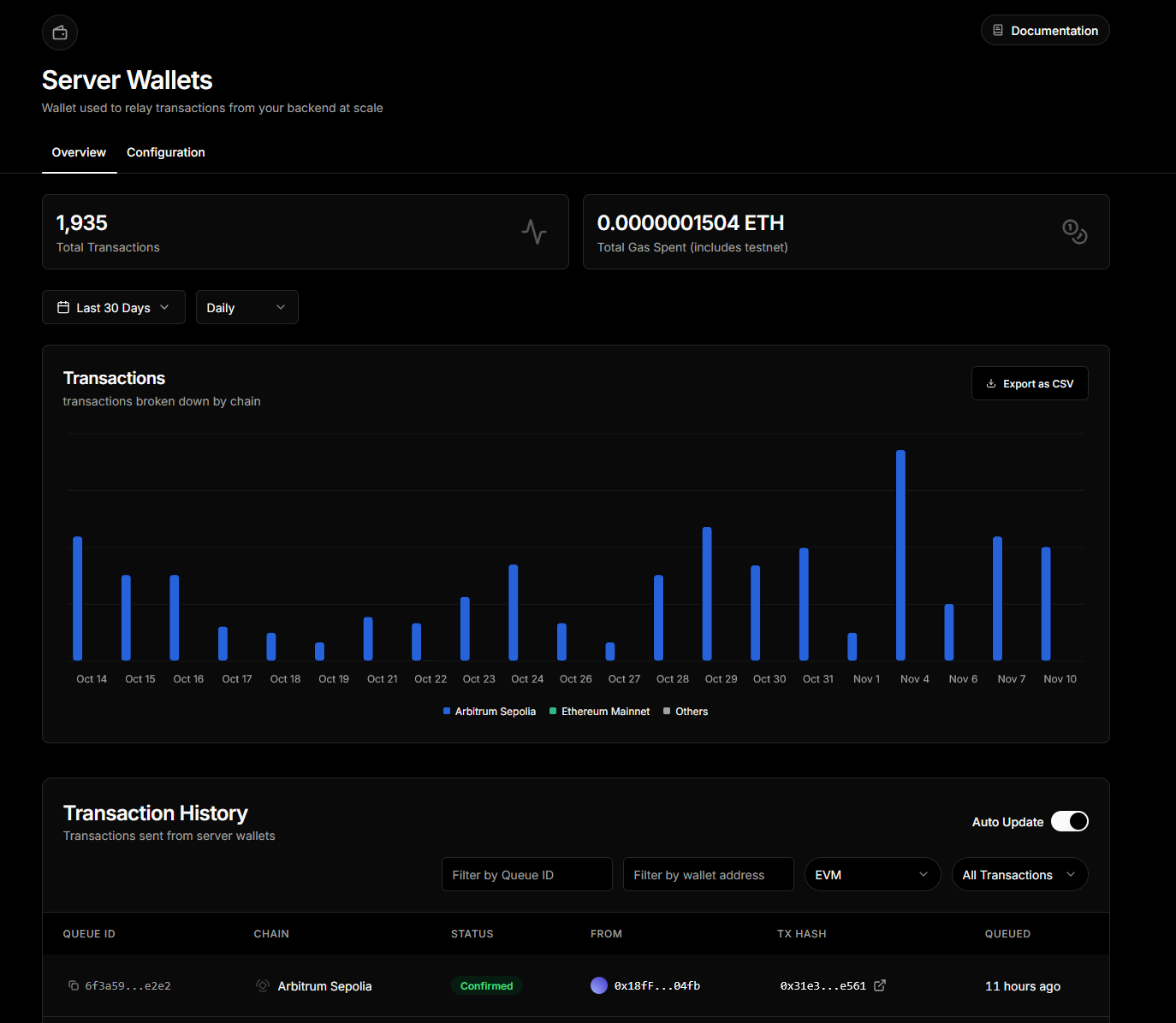 Similarly to User Wallets, you can view analytics about transactions made from your backend as well as the EVM and Solana server wallets you have configured. This was previously all of the UI from the Transactions tab.
