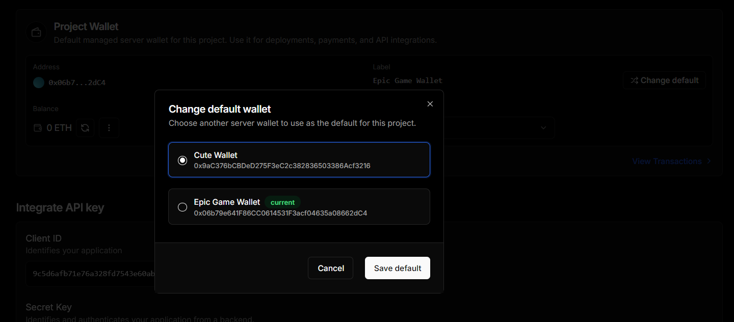 When multiple server wallets exist, pick a new default directly from the card. The change propagates instantly across integrations.