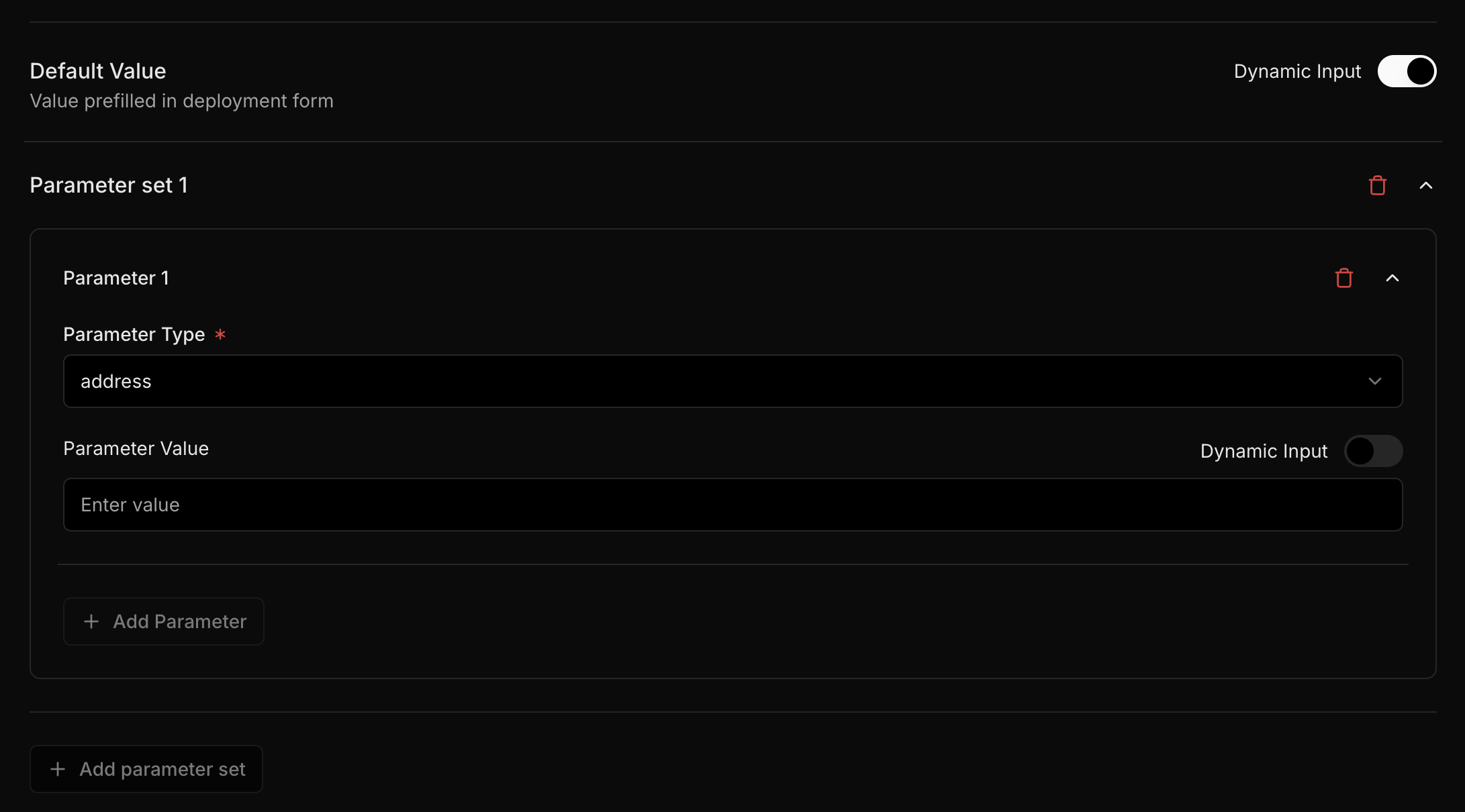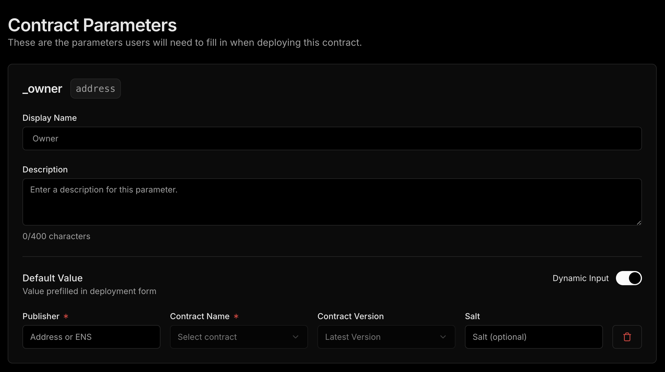 For e.g., _owner param is of type address and allows publisher to specify a contract reference. You can do this by selecting Dynamic Input and providing details of the published contract. Please note that the contract being set as reference should be a published contract with default values pre-filled.