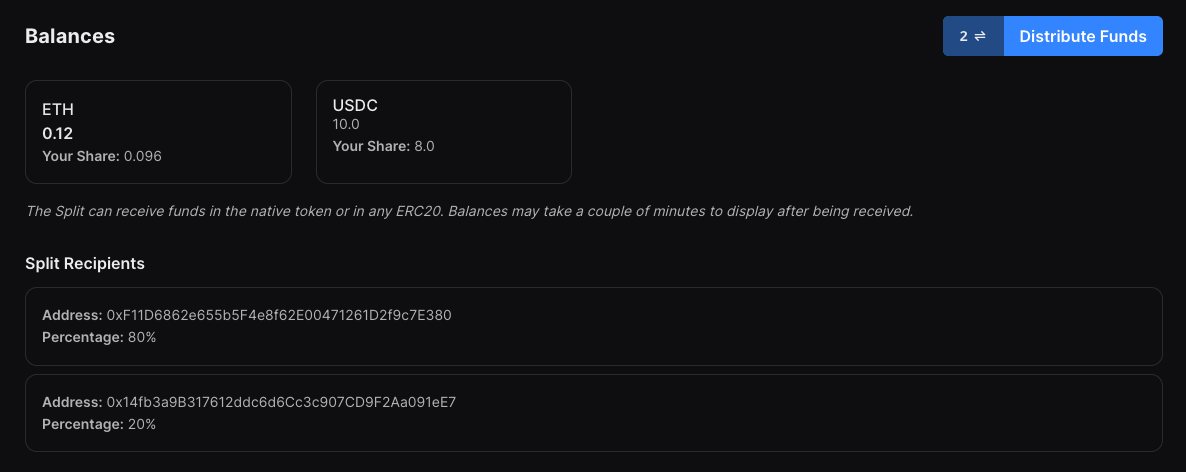 When creating a Split contract, you can hold native token and any arbitrary ERC20 token and distribute among the wallets you've set on deployment.