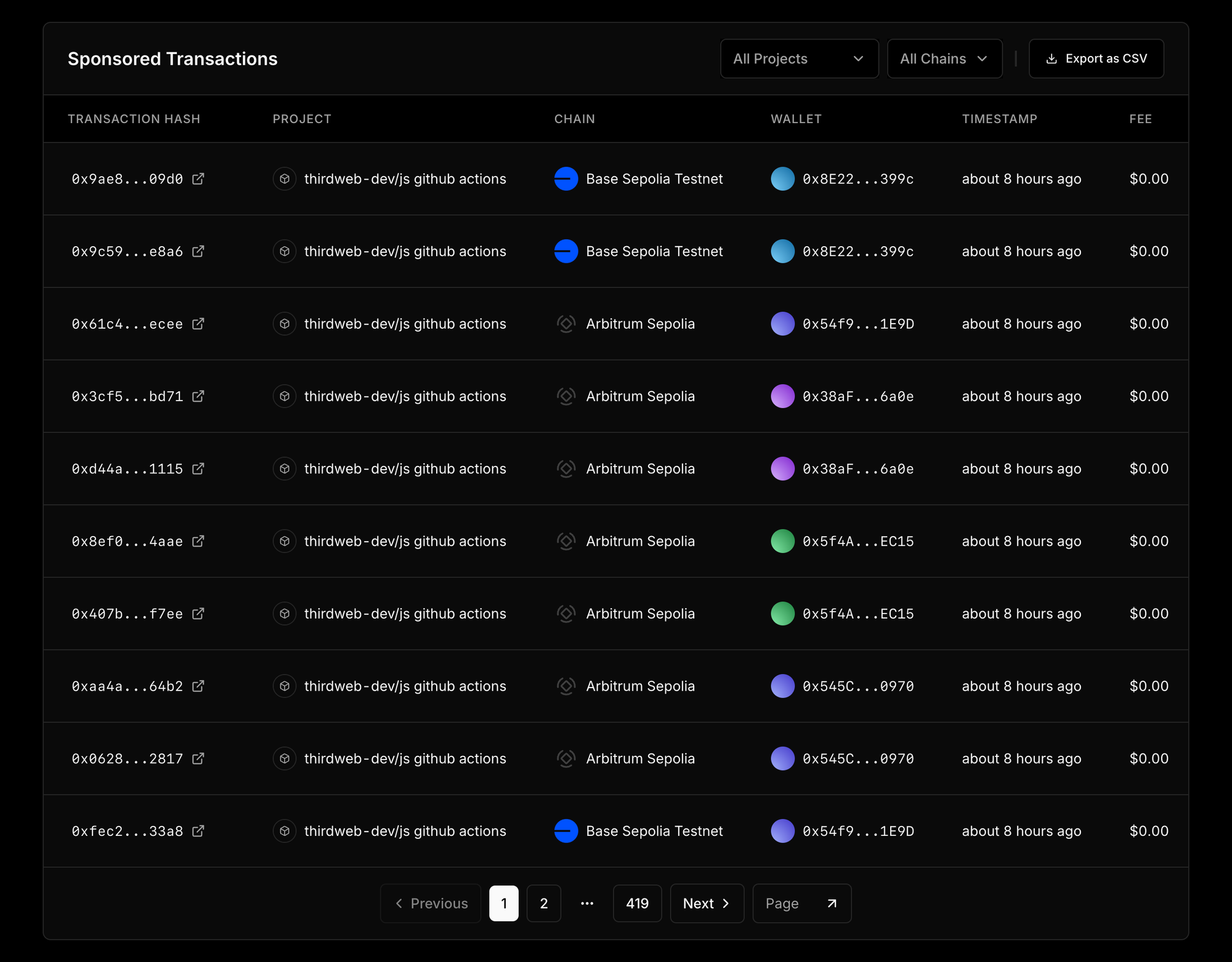 You can now view the list all sponsored transactions across in a team by going to your Team > Usage Page in thirdweb dashboard