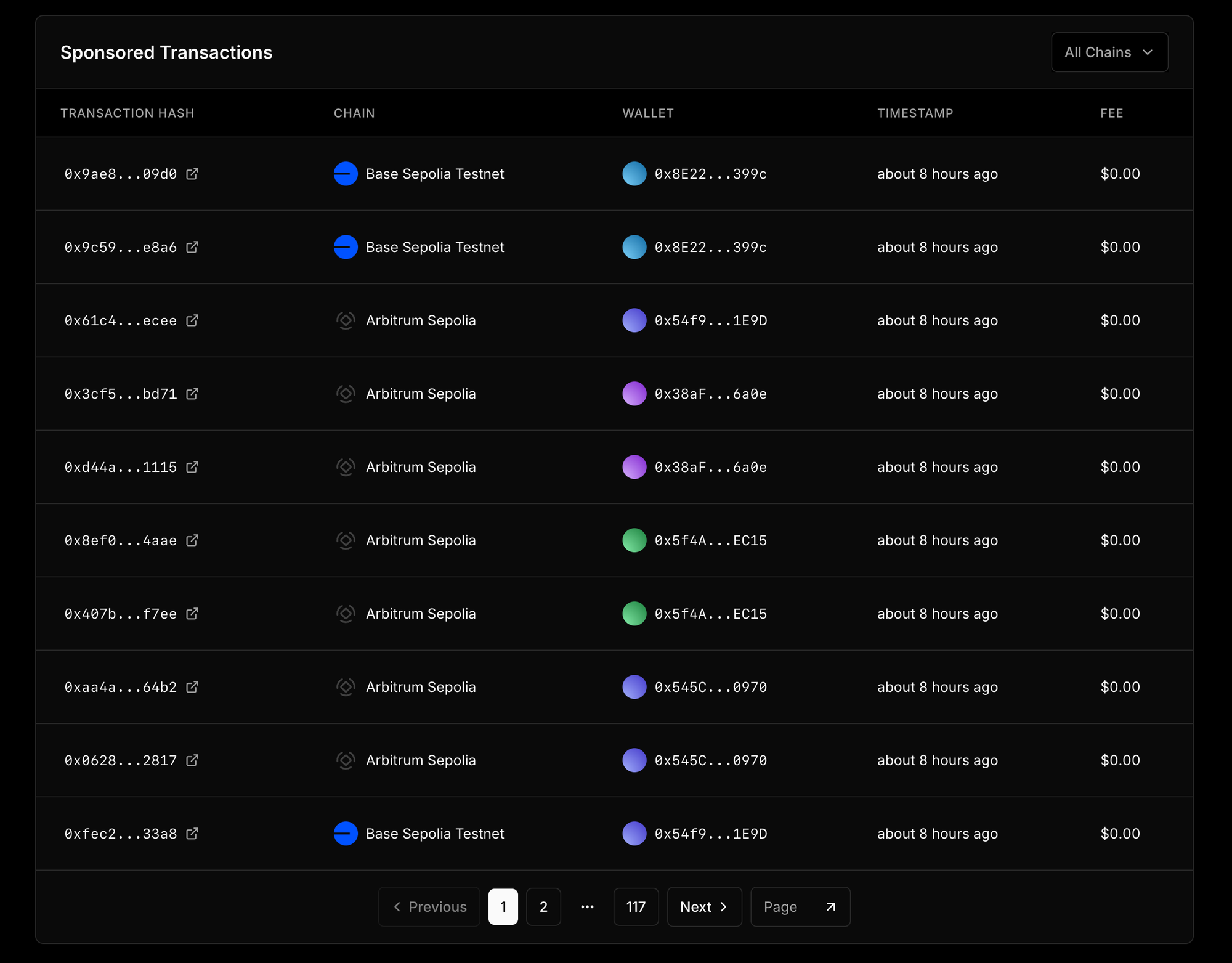 You can also view this table in your Team > Project > Connect > Account Abstraction > Analytics page to see only sponsored transactions for the selected project