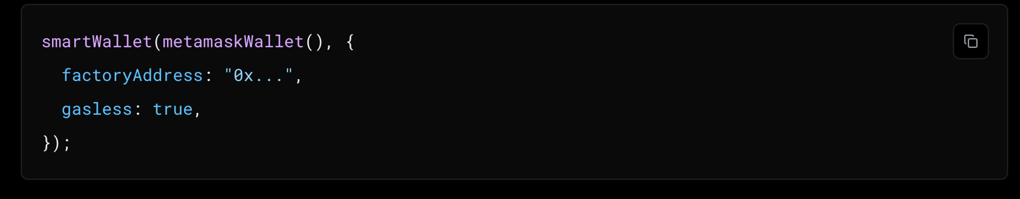 You can easily set sponsorship rules through the configuration tab in the smart wallet dashboard. Once set, you can simply use the API key in your project and sponsorship rules will automatically be applied. Sponsorship rules are multichain by default and are not tied to an account factory.