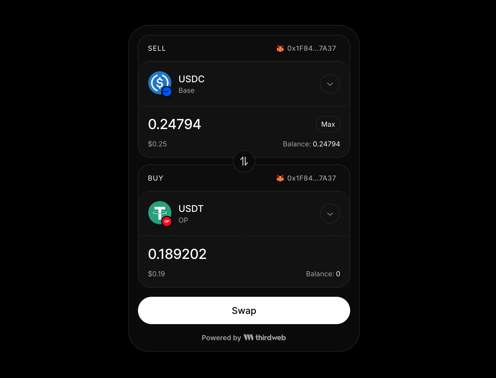 import { SwapWidget } from "thirdweb/react";