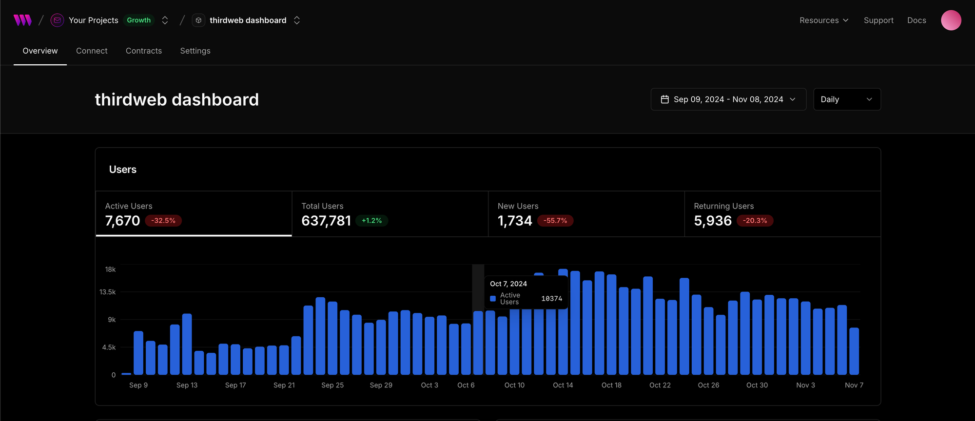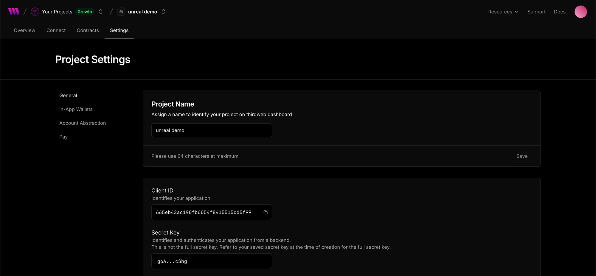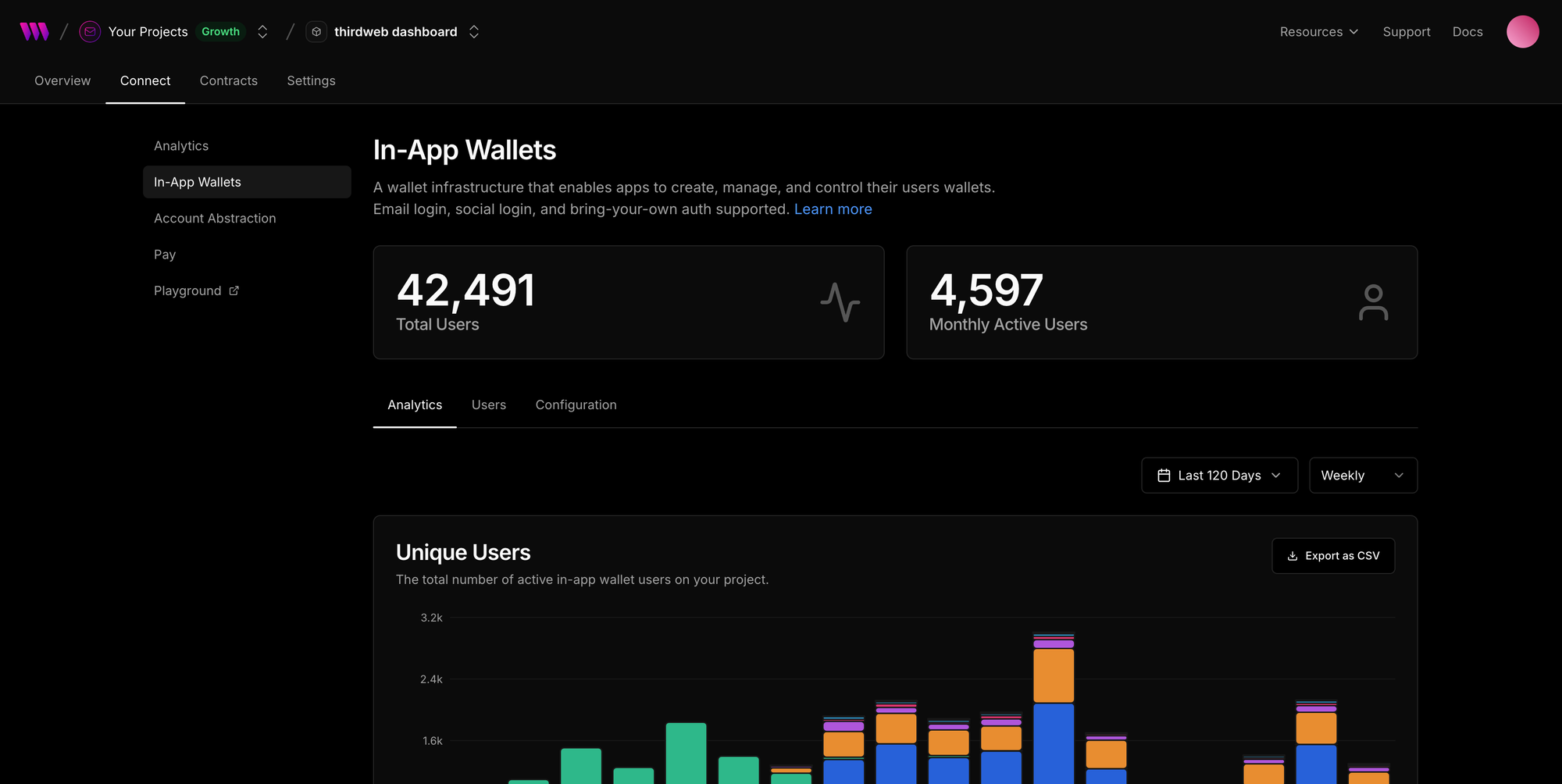 You can click on your project to view analytics, configure thirdweb services and manage settings.