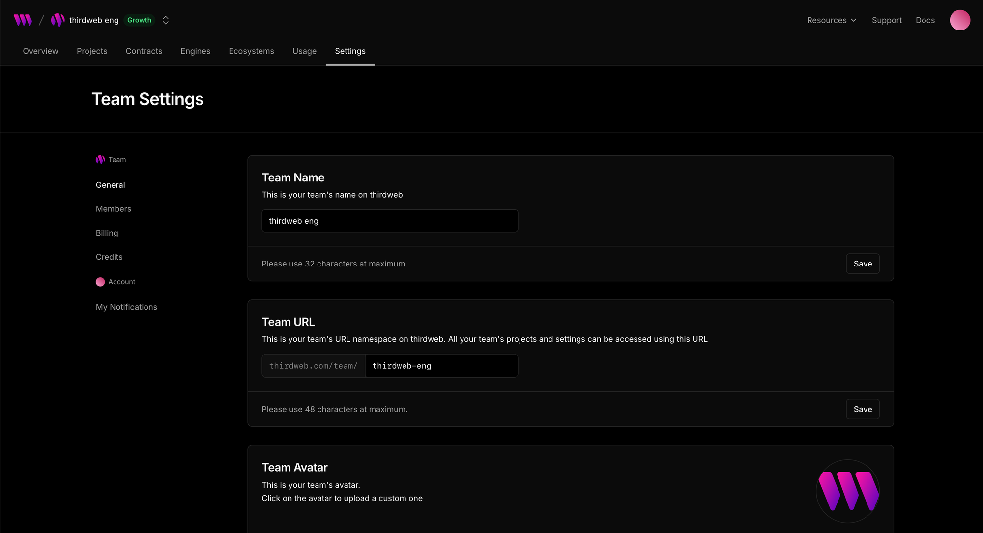 Manage your team's general settings, team members, billing, gas credits and notification alerts in team settings dashboard