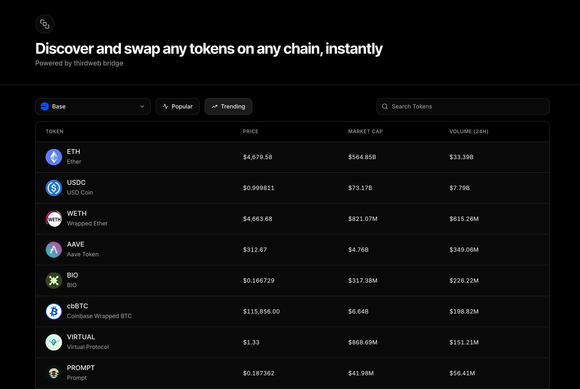 Tokens: Discover and swap any tokens on any chain, instantly