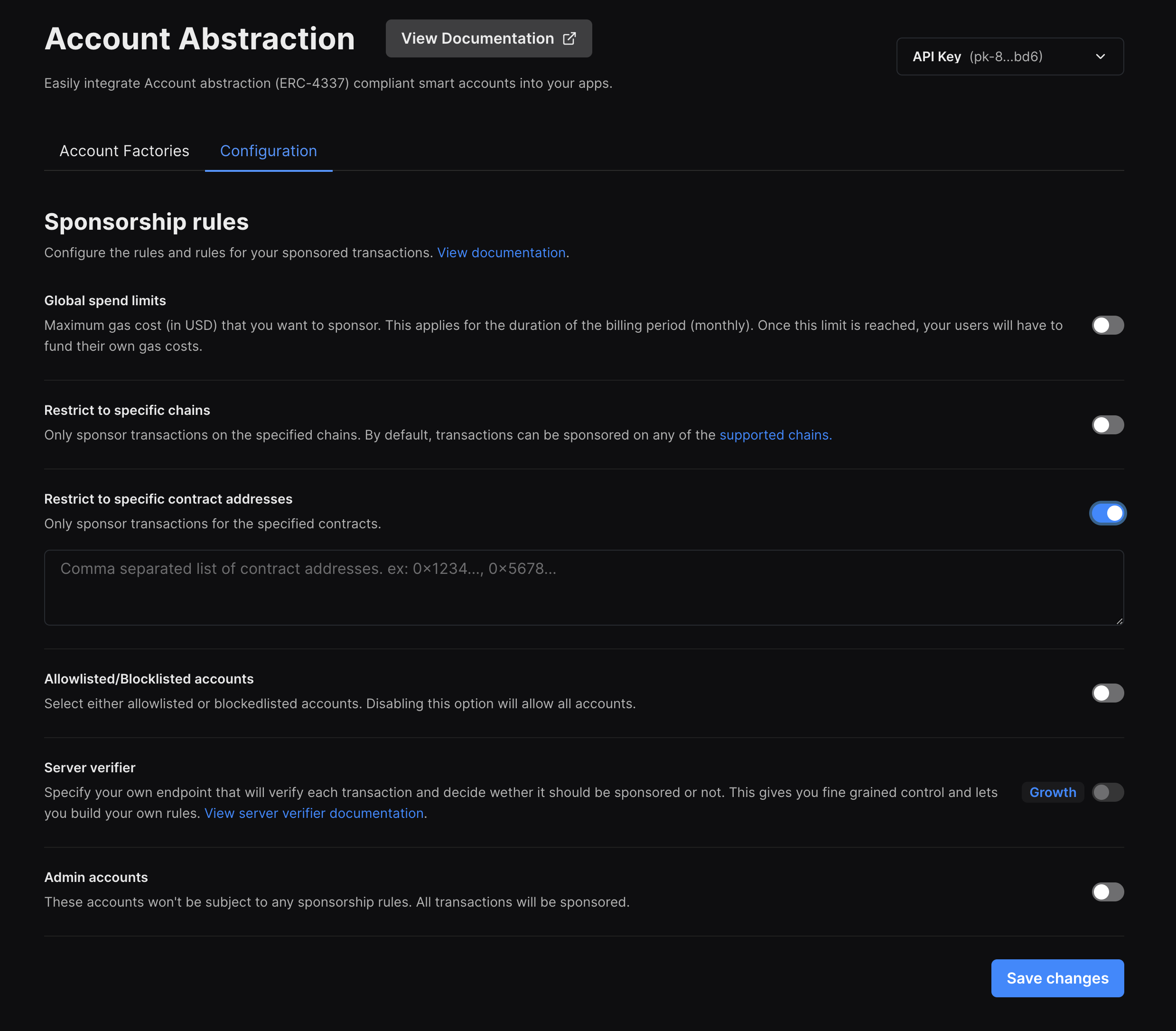 Allowed contract addresses, which let you restrict User Ops to a specific set of allowlisted contracts, is now available under the Sponsorship rules section of the Account Abstraction dashboard under the "Restrict to specific contract addresses" rule
