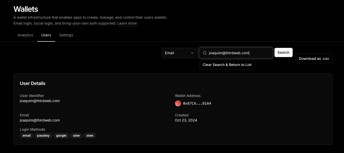 Select the search criteria, type a value and hit search. Great for quickly finding user associated addresses or emails.