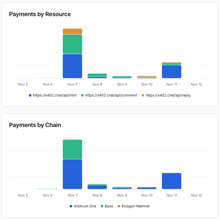 We just added comprehensive analytics for your x402 enabled APIs, so you can see payments and volume by resource, buyer and chain.
