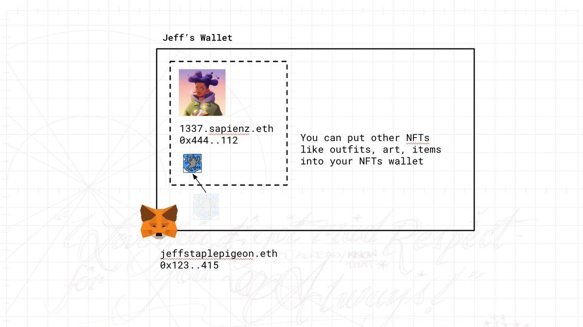 In Sapienz, users receive a character that they can customize with cosmetics — which they unlock depending on which other NFTs they hold. These cosmetics are then bound to the Sapienz, which have their own “inventories” in the form of token bound accounts.