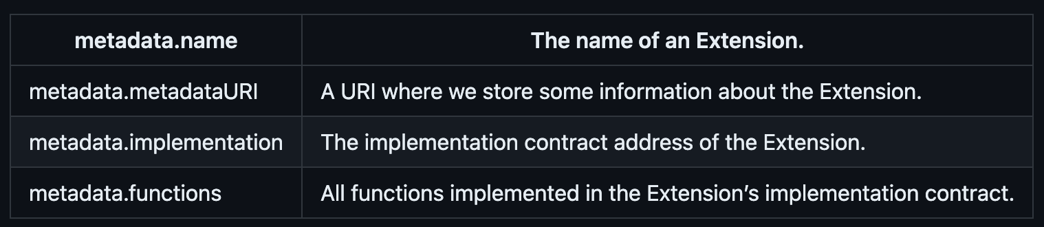 - An extension’s metadata URI allows for specific coordination between smart contracts and clients about how to understand, interact with or render UI for a given extension of a router.
