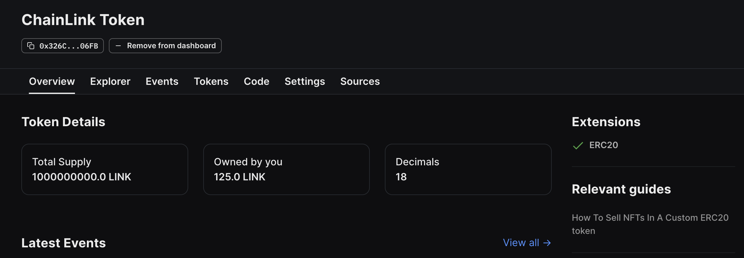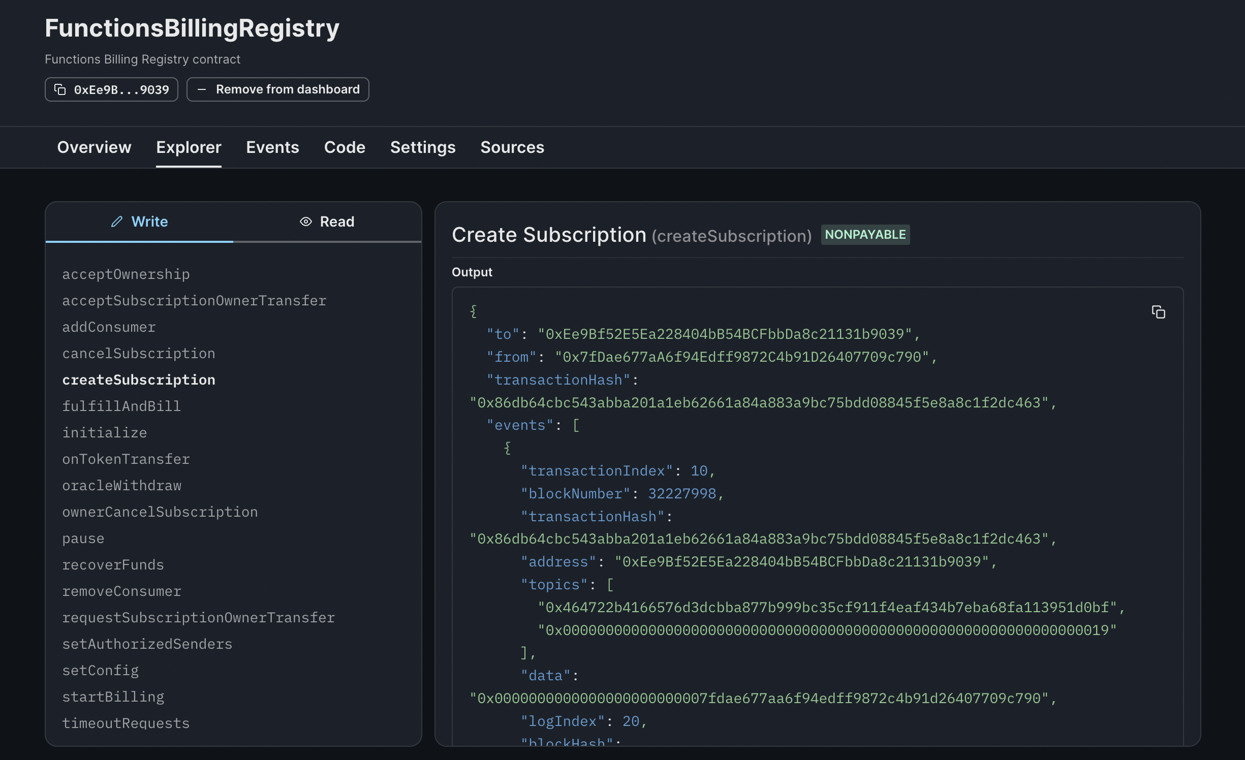 A Subscription Manager is used to create a Subscription Id to manage and fund your consumer contract. This method follows the same format as Chainlink VRF. Currently, there is no front-end to perform these actions; however, using the thirdweb Dashboard, this is simple.