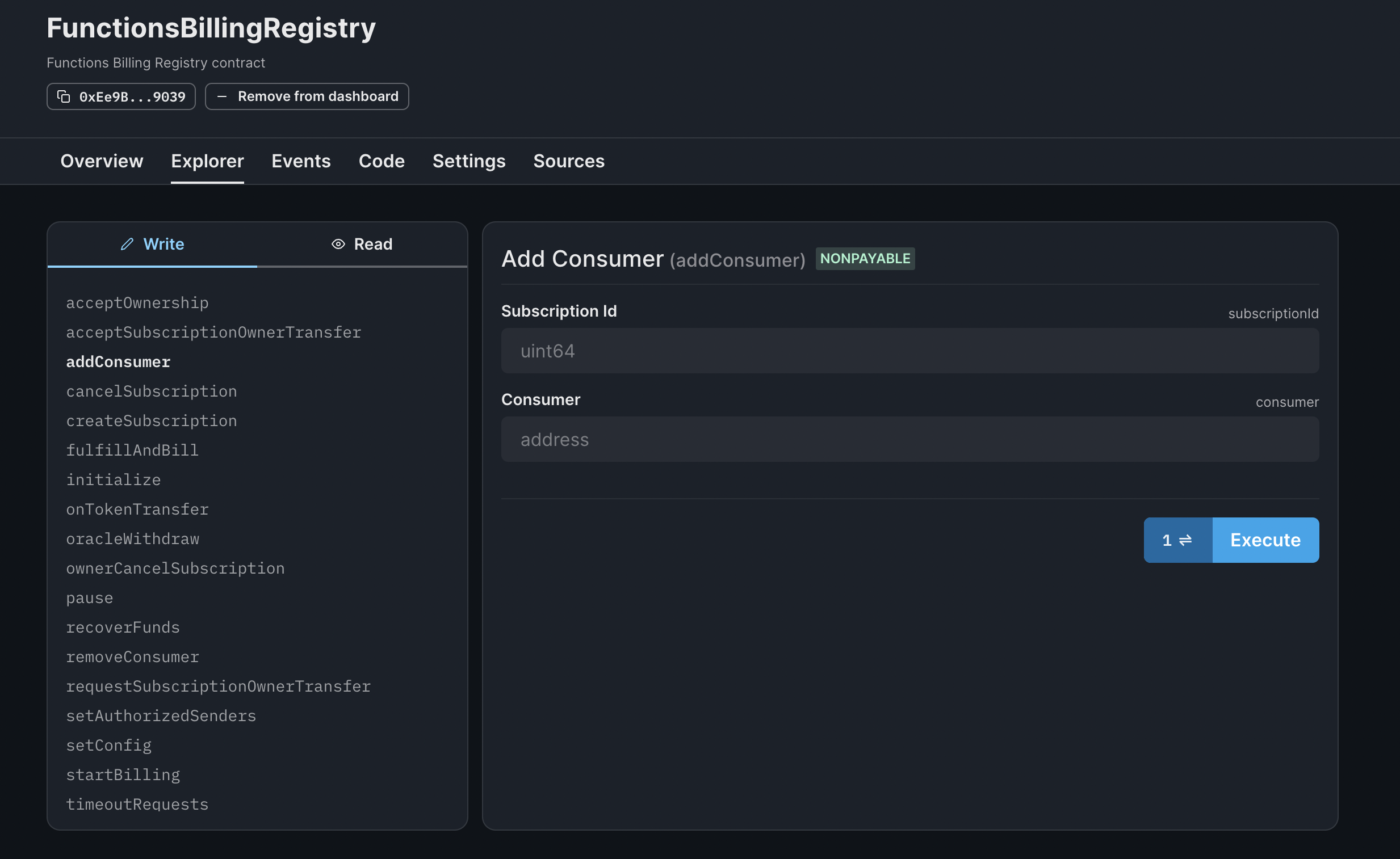 Your consumer contract that you deployed needs to be added to the Subscription Id you created so that requests can be made to the DON. Head to the Functions Billing Registry contract and select the addConsumer write function