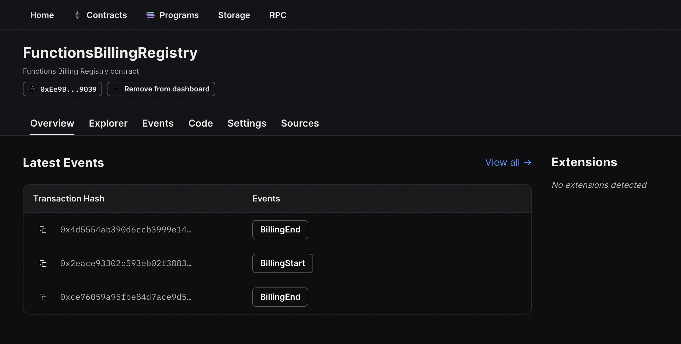 Firstly, import the FunctionsBillingRegistry contract corresponding to the chain you would like to work on; a list can be found here. Simply paste the contract address into the search bar at the top of your Dashboard homepage and click Add to your Dashboard, located next to the contract address. This enables you to access this contract at a later date by selecting from your contracts in the Contracts tab.