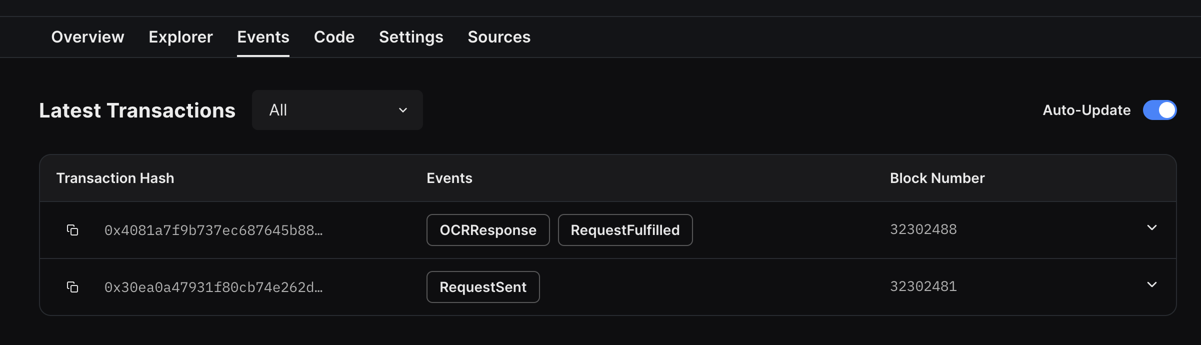 To check if the result has been returned, head to the Events tab, where you should be able to see a RequestSent event and subsequent OCRResponse RequestFulfilled events once the response has been returned.